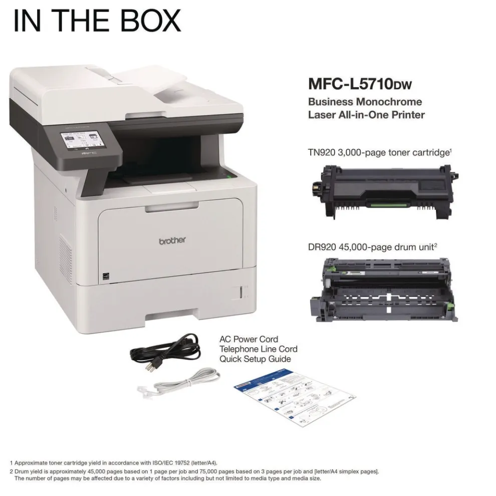 The Brother MFC-L5710DW business monochrome laser all-in-one printer is a great choice for busy offices and small workgroups that need cost-efficient printing, versatile paper handling, advanced security features, and reliable, high-quality output. This high-performance all-in-one printer helps to increase productivity with fast print and copy speeds up to 48 ppm. Delivers cost-efficient printing by using the Brother Genuine TN920XXL super high-yield replacement toner cartridge. Triple Layer Security features help to limit document and device access and protect against network intrusions. Offers expandable paper capacity that is scalable as your business needs grow. Quickly scan multi-page documents to a wide variety of destinations using the 50-page capacity auto document feeder. The 3.5″ touchscreen display allows for the creation of customized shortcuts to your most frequently used workflows. The MFC-L5710DW also provides flexible connectivity with built-in Gigabit Ethernet and dual band wireless networking, plus convenient mobile device printing to meet mobile workforce demands.