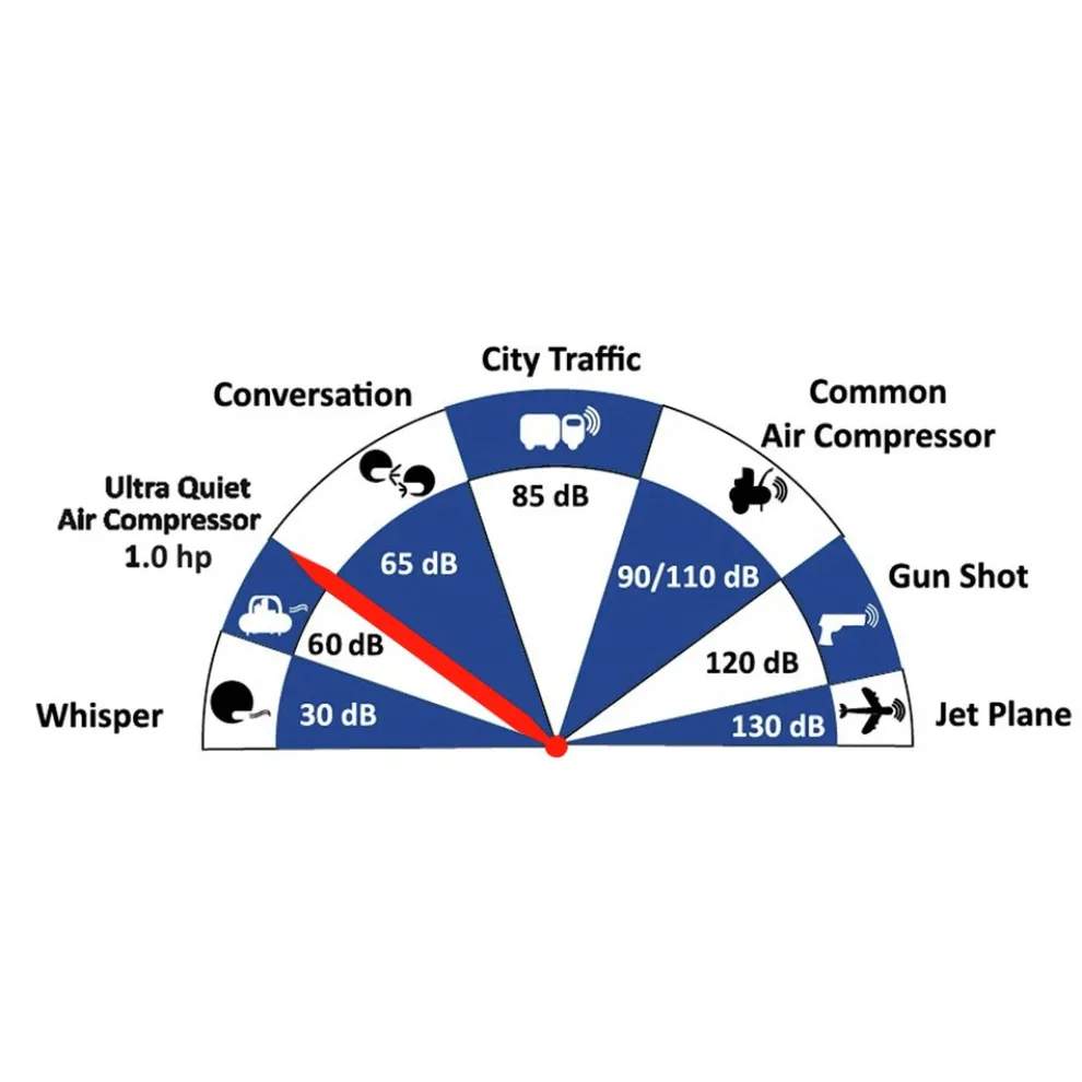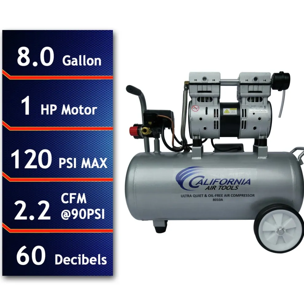 The California Air Tools 8010A Ultra Quiet, Oil-Free and Lightweight Air Compressor is designed to be one of the quietest air compressors in the industry at a noise level of just 60 dB The powerful 1 HP motor operates at only 1680 RPM, creating less noise and less wear. The oil-free dual piston pump system is engineered for high performance and durability. This pump is designed to have a life cycle before wear of 3000 plus Hours compared to other comparable air compressors with life cycles of 500 Hours or less. The oil-free pump allows for use in a variety of temperatures and uneven terrains. The large 8 gal. Rust Free Aluminum Air Tank is Lightweight (38 lbs.), and the wheel kit makes it very easy to transport. This air compressor is ideal for anyone working inside where noise is a major issue.