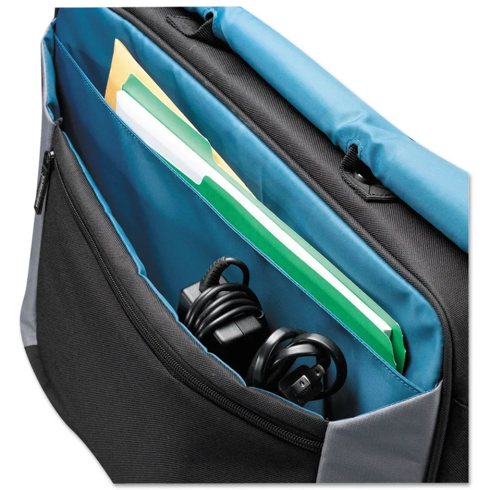 Contemporary messenger styling with convenient top-load access for laptops. Practical organization enables storage for everything else you need to carry. Padded, zippered pocket on the back of the bag securely holds up to 17 in. laptop. Roomy storage underneath flap for files, power brick and other bulk storage needs. Accessory pockets for portable mouse, cell phone and pens secure front wall zipper compartment. Integrated USB drive pocket. Removable shoulder strap and padded handle. Luggage strap securely attaches messenger bag to most rolling luggage.