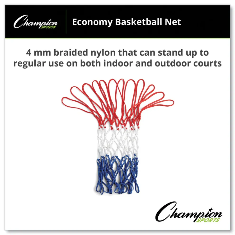 Help young players improve their shooting skills with this Champion Sports 4 mm Economy Basketball Net. Available in eye-catching colors of red, white and blue, this basketball net is made with a 4 mm braided nylon that can stand up to regular use on both indoor and outdoor courts. Perfect for replacing a damaged net, this economical design fits most standard-sized basketball rims.