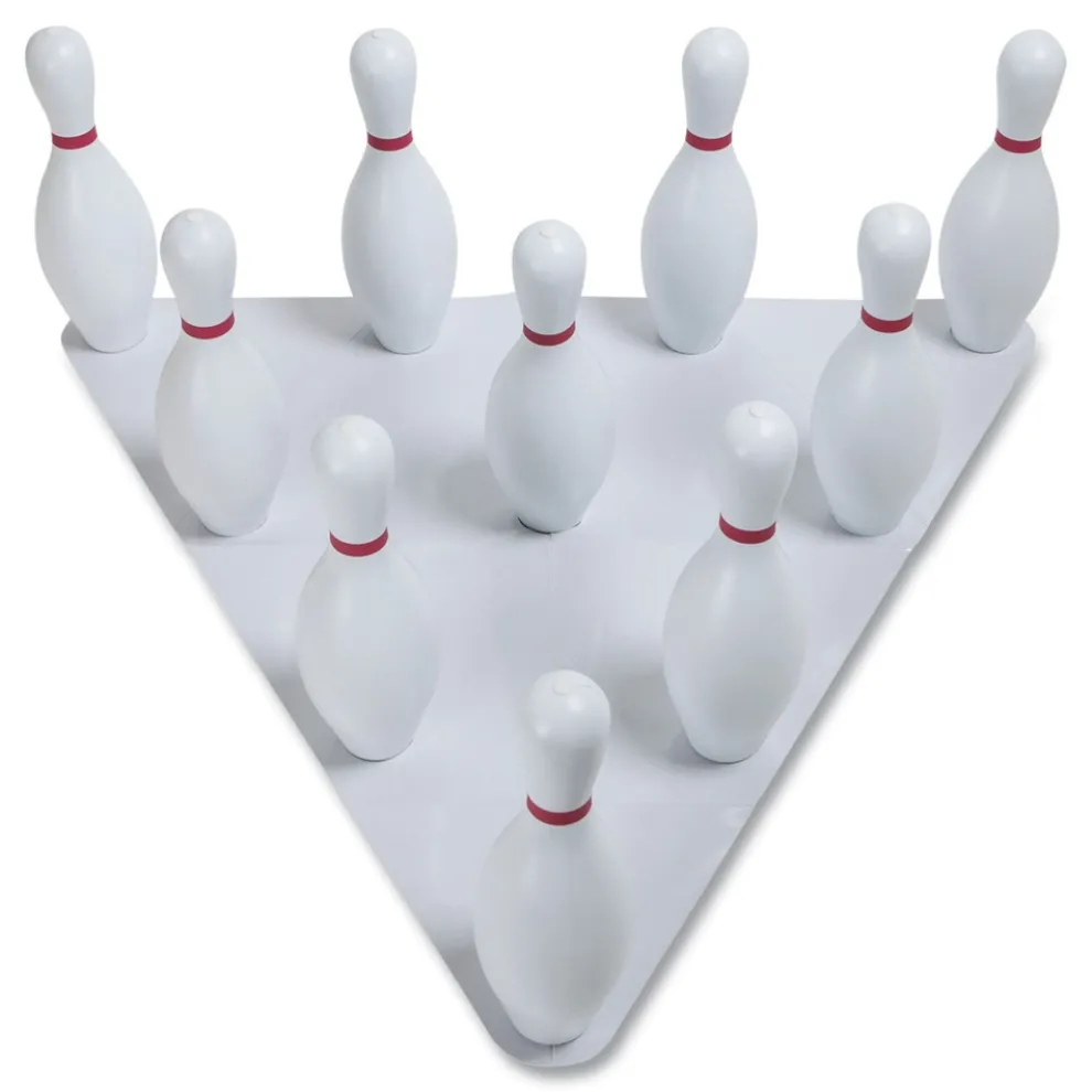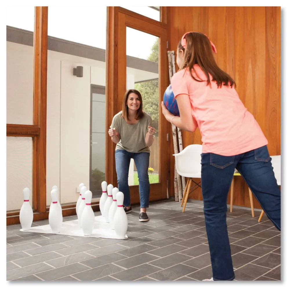 Includes (1) 4.5 lbs. blue/red rubber bowling ball and (10) white plastic pins