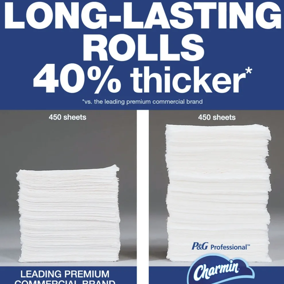 Introducing Charmin Toilet Paper for commercial use! Provide your guests with a noticeably softer bathroom experience. With 40% thicker and 40% more absorbent toilet paper rolls, Charmin is long-lasting and a great value for your business. Charmin Commercial Toilet Paper Rolls are perfect for hospitality, restaurants, and other businesses that want to provide more softness and strength for a superior guest experience.