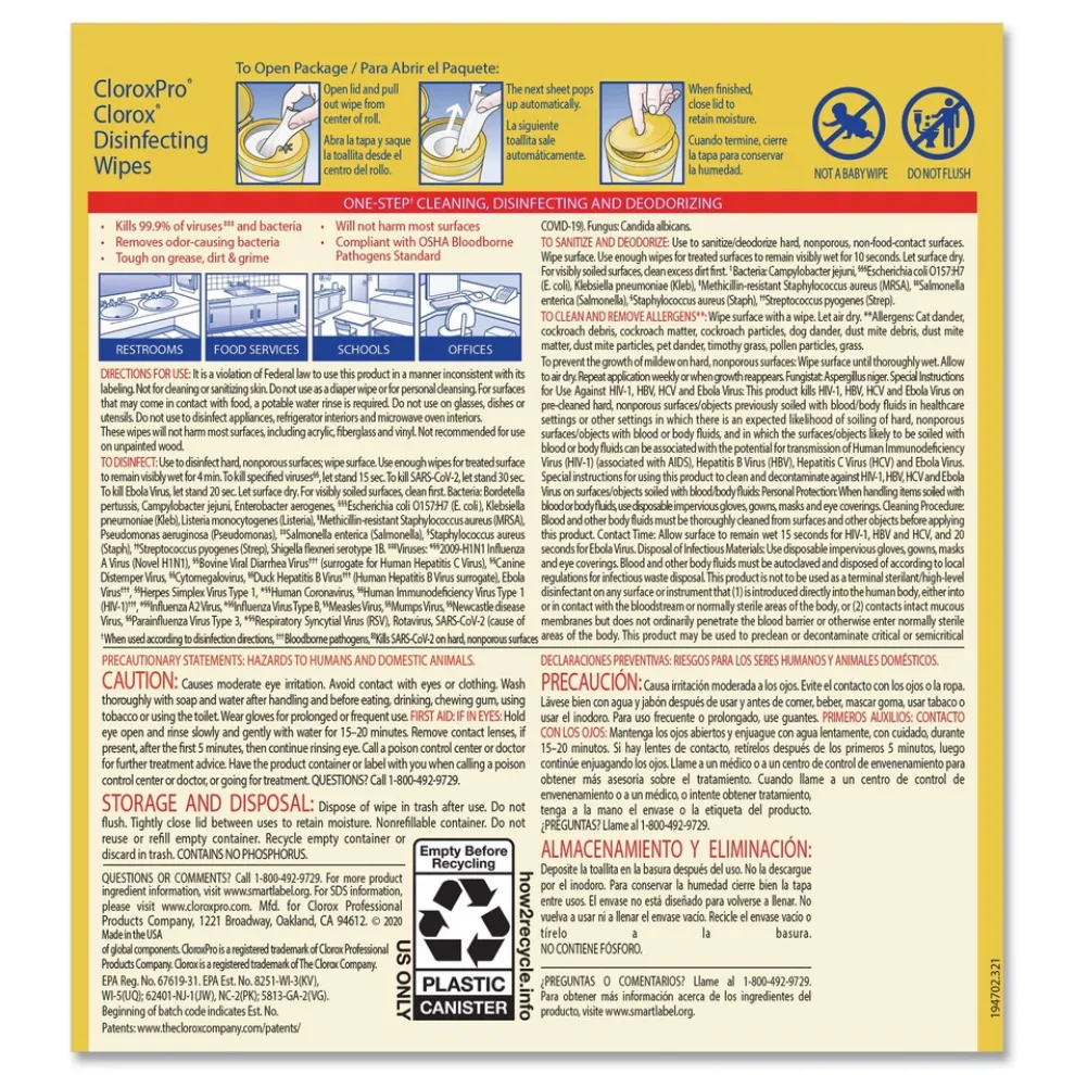 Clorox Disinfecting Wipes clean, disinfect and remove allergens leaving behind a pleasant scent. Disinfecting Wipes clean and disinfect with antibacterial power that kills 99.9% of viruses and bacteria that can live on surfaces, including COVID-19 Virus, staph, E. coli, MRSA, salmonella, strep and Kleb on hard, nonporous surfaces when used as directed. These all-purpose disposable wipes remove common allergens, germs and messes on surfaces like kitchen counters, bathroom surfaces and more. Disinfecting Wipes are safe to use on a variety of surfaces including non-food-contact surfaces in the home, office, daycares, schools, hotels, restaurants, and more. Use as directed. Allow product to air dry.