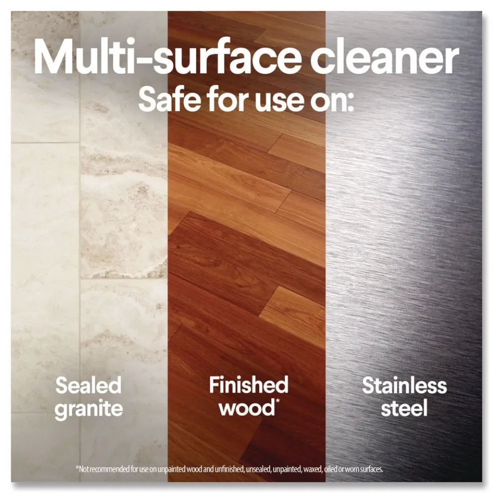 Multi-surface cleaning wipes are safe for finished wood, sealed granite and stainless steel; use on non-food-contact surfaces in the home, office, classroom, pet area, dorm, locker room and more.