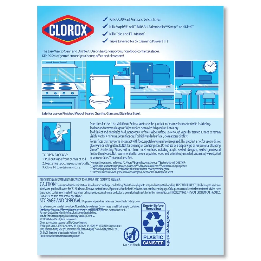 Clorox Disinfecting Wipes clean, disinfect and remove allergens leaving behind a pleasant scent. Disinfecting Wipes clean and disinfect with antibacterial power that kills 99.9% of viruses and bacteria that can live on surfaces, including COVID-19 Virus, staph, E. coli, MRSA, salmonella, strep and Kleb on hard, nonporous surfaces when used as directed. These all-purpose disposable wipes remove common allergens, germs and messes on surfaces like kitchen counters, bathroom surfaces and more. Disinfecting Wipes are safe to use on a variety of surfaces including non-food-contact surfaces in the home, office, daycares, schools, hotels, restaurants, and more. Use as directed. Allow product to air dry.