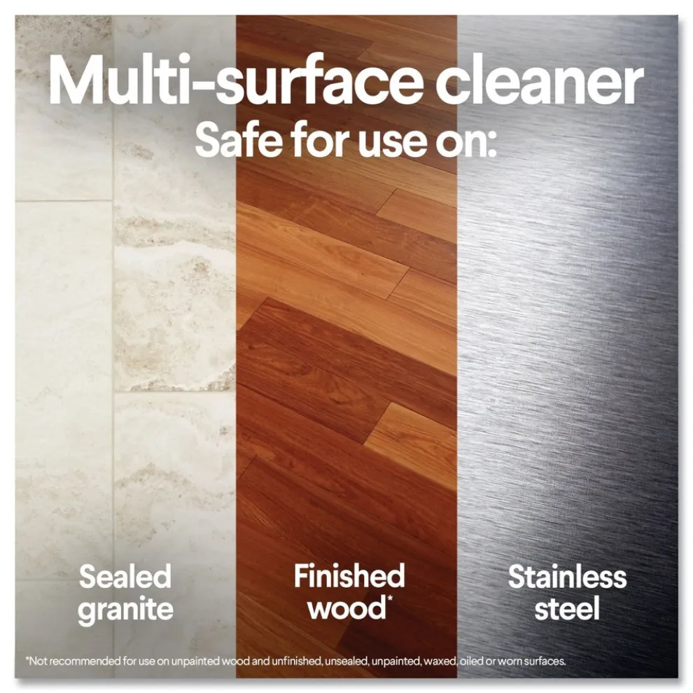 Multi-surface cleaning wipes are safe for finished wood, sealed granite and stainless steel; use on non-food-contact surfaces in the home, office, classroom, pet area, dorm, locker room and more