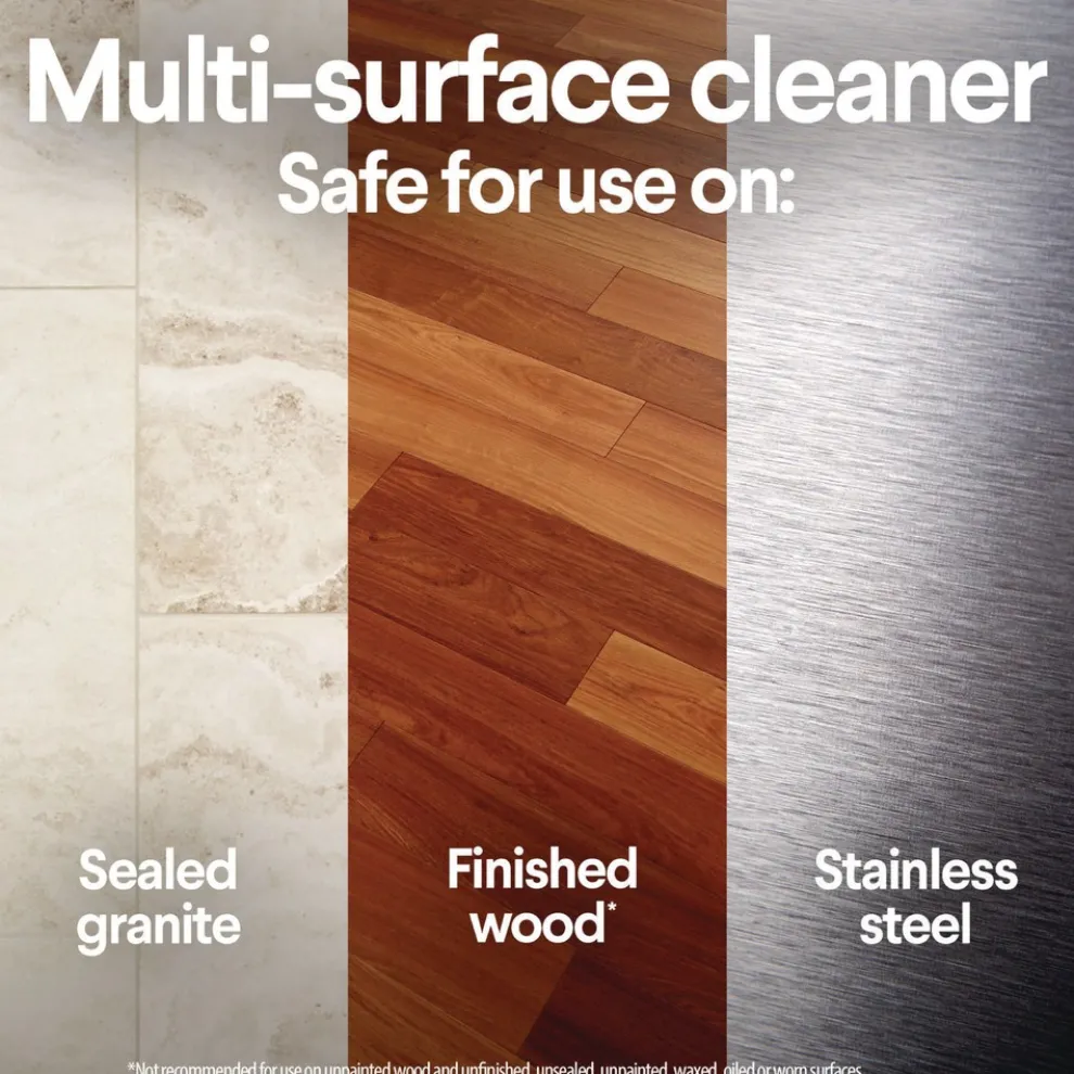 Safe for finished wood, sealed granite and stainless steel and on non-food-contact surfaces in the home, office, classroom, pet area, dorm and locker room