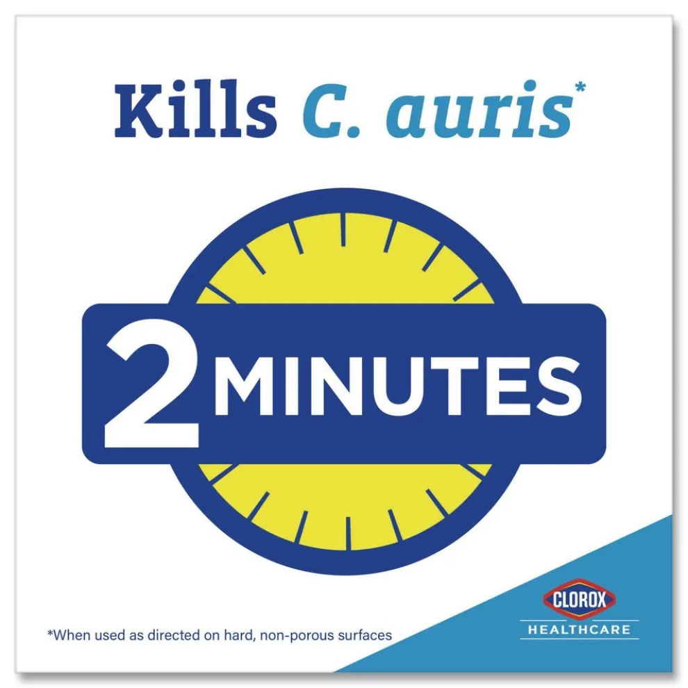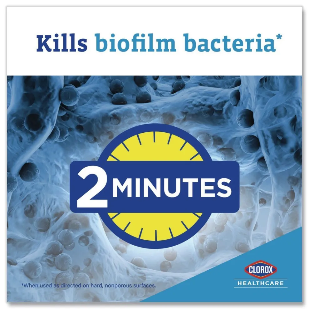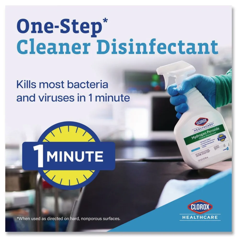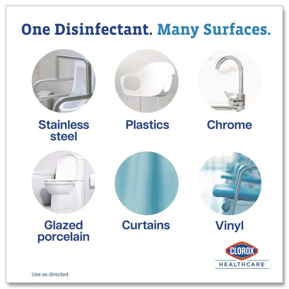 Better surface compatibility, less residue. Clorox Healthcare Hydrogen Peroxide Cleaner Disinfectants are made with no added fragrances or harsh odors and are EPA registered to kill over 40 microorganisms in 1 minute or less, including SARS Co V2 in 30 seconds on hard nonporous surfaces when used as directed. Worry less with noncorrosive disinfectants tested on medical devices and save time with fast non bleach disinfectants. Clorox Healthcare hydrogen peroxide disinfectant is a bleach-free sanitizer that is EPA registered to kill bacteria on soft surfaces in 30 seconds. Use in hospitals, operating rooms, outpatient surgery centers, emergency rooms, dental offices, veterinary offices and long term care facilities. Use as directed, refer to the EPA master label for a complete list of organisms and contact times.