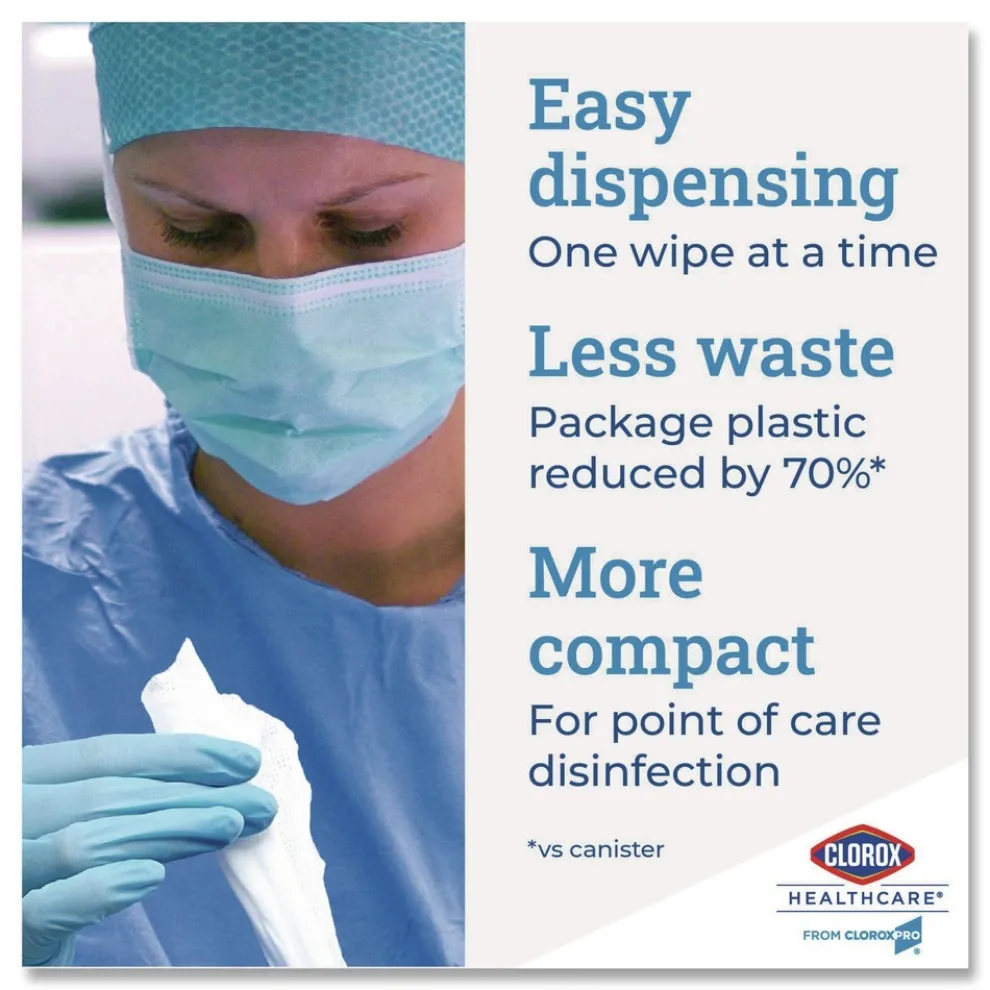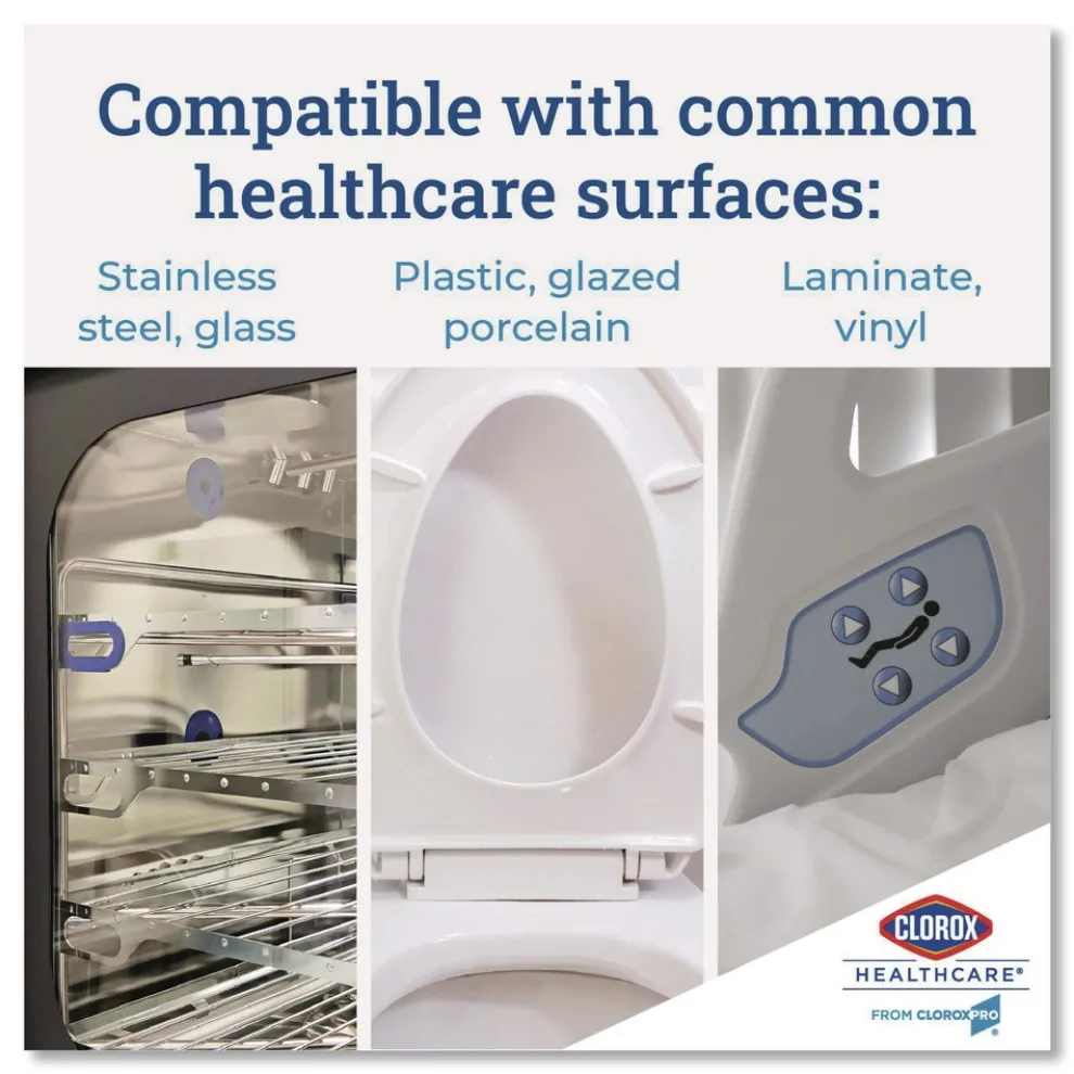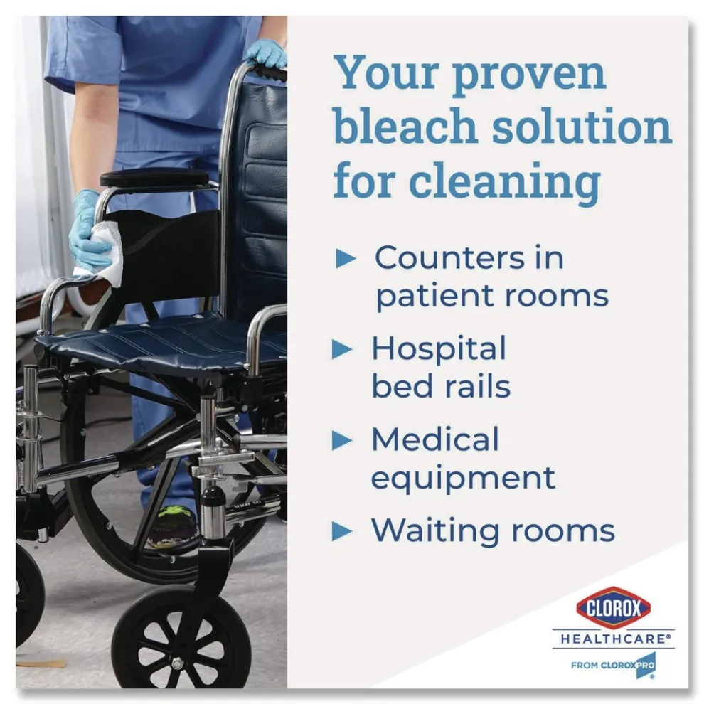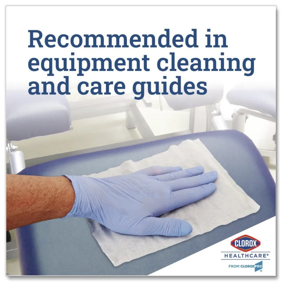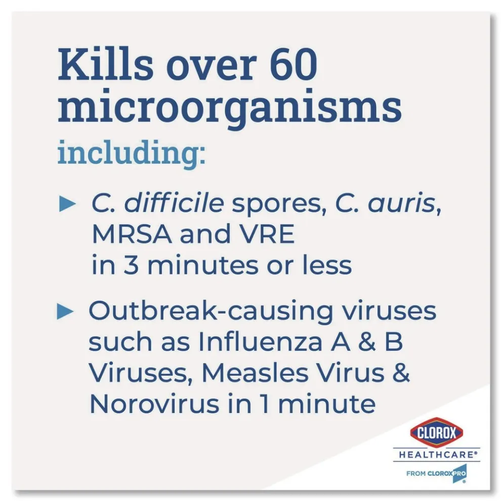 Your proven bleach solution for cleaning. Clorox Healthcare Bleach Germicidal Wipes kill C. difficile and C. auris in three minutes and 58 other microorganisms in one minute or less, including outbreak causing viruses, emerging viral pathogens, MRSA and VRE when used as directed. With superior surface compatibility on a wide range of hospital surfaces, these disinfecting wipes help you cover more square footage per wipe with fast contact times and greater wetness surface coverage than the leading competitor. The phosphate free formula is optimized to be easy on surfaces and leaves less residue behind. Use in healthcare settings including hospitals, medical facilities, outpatient facilities and long term care facilities. Follow special instructions for cleaning prior to disinfection.