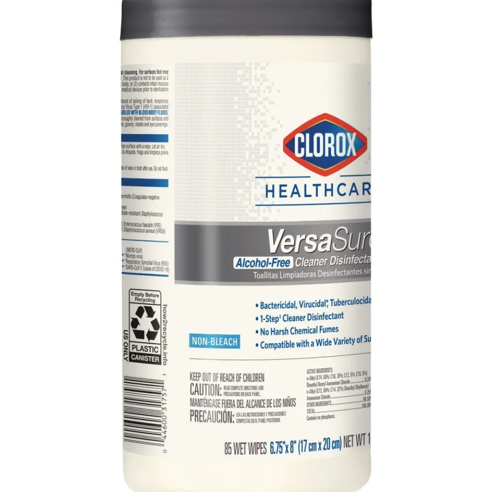 Clorox Healthcare VersaSure Cleaner Disinfectant Wipes kill over 40 pathogens quickly on a broad range of surfaces. These strong and durable clothlike wipes are your alcohol free solution to cleaning and disinfecting. VersaSure wipes are EPA registered to kill pathogens on hard surfaces in as fast as 30 seconds for most bacteria and viruses, including mumps, measles, MRSA and tuberculosis. These one step disinfecting wipes meet EPA efficacy testing requirements for hospital disinfection, making them great for daily use in your healthcare facility. Designed for patient and staff comfort, the alcohol free quat formula is made with no harsh chemical odors, fumes or added fragrances. The nonwoven wipe does not leave lint on surfaces, and the larger wipe covers more surface area with less effort. Intended for use in healthcare settings.