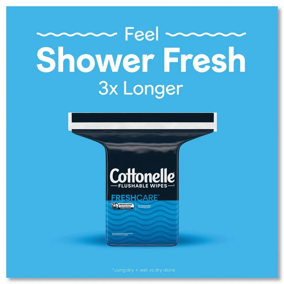 For a superior clean* that’s fresh, gentle, and effective, choose Cottonelle FreshCare Flushable Wipes with the CleaningRipples Texture. Cottonelle bathroom wipes are 100% flushable, remove odor-causing bacteria and offer a large, dual layer wipe to clean better than when using dry toilet paper alone. These sanitary wipes are sewer-safe and septic-safe. *using dry + moist vs. dry toilet paper alone.