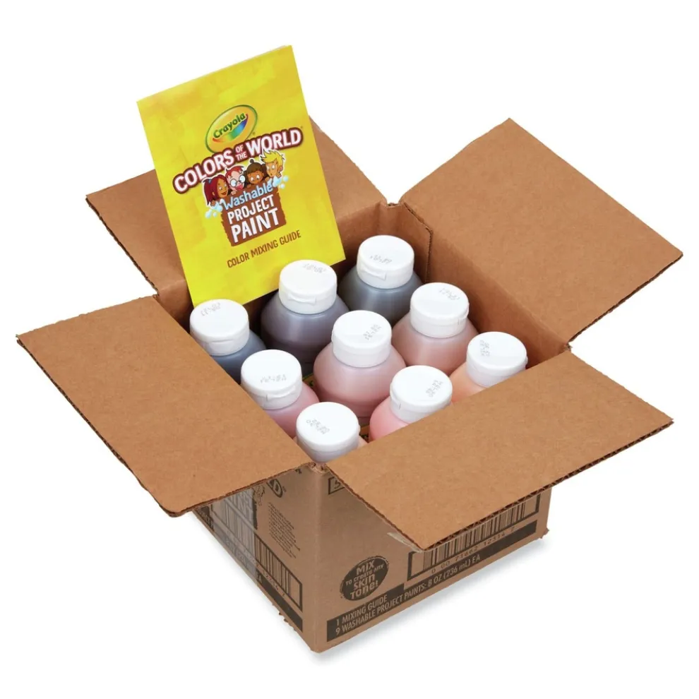 Express your creativity with this Crayola Colors of the World Washable Kids Paint Set in 9 resealable 8 oz. bottles. This worry-free project paint provides hours of fun and cleans up easily. Children can choose from a range of skin tone paints created to mirror authentic skin colors. Designed to inspire, this pack of Crayola Multicultural Kids Paint is perfect for activities on diversity and self-awareness. Each washable color is specially formulated to wash cleanly from skin and most washable clothing. This paint set for kids is great to have on hand for school projects, crafts, and creative play. Pair with Crayola Colors of the World Crayons for even more creative, customized fun. Safe and nontoxic, ideal for children ages 3 and up.