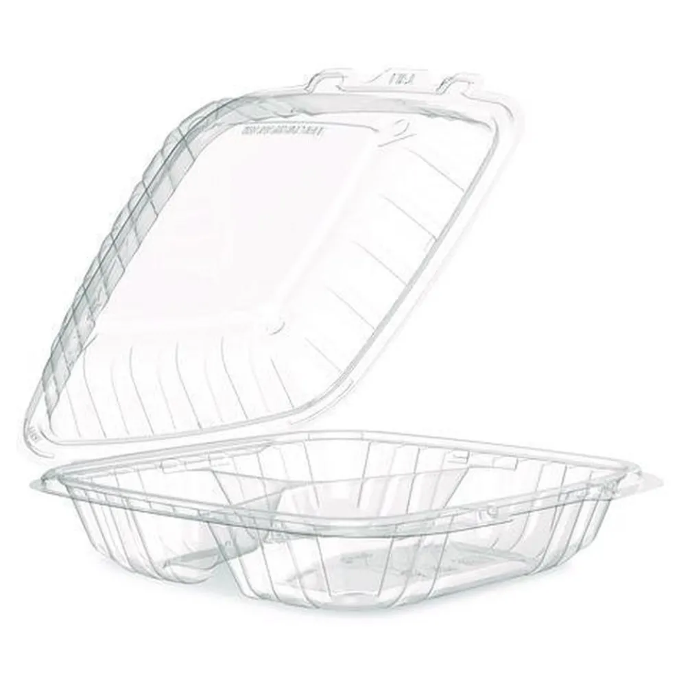(150/Carton) 9 in. x 8.75 in. x 3 in. 3-Compartments ProPlanet Microwaveable Plastic Hinged Containers – Clear – 90PPHT3