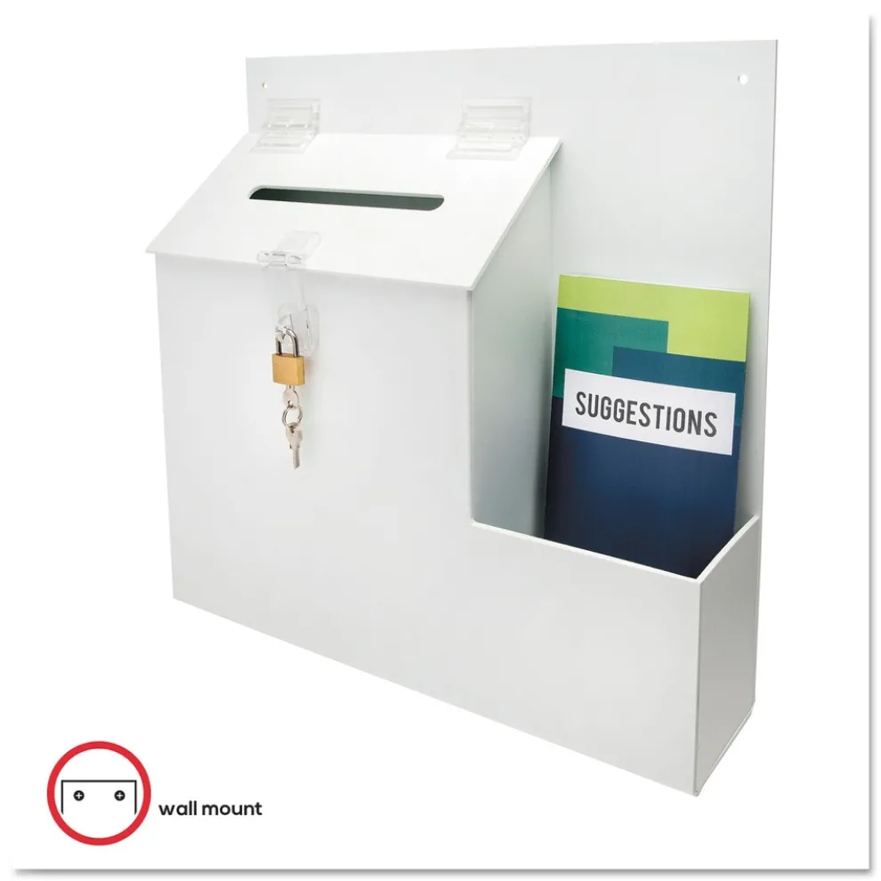This popular suggestion box is a great way to encourage employee engagement and maintain continuous improvement in your business. It features a locked lid to help keep sensitive materials out of the wrong hands, or keeps other secured documents safe if secured to a wall. This durable, white suggestion box can be set upright on a countertop or mounted to the wall (screws included). The built-in pocket easily accommodates card, paper and small envelope suggestions up to 4.13 in. wide. Drop slot measures 5.5 in. wide.