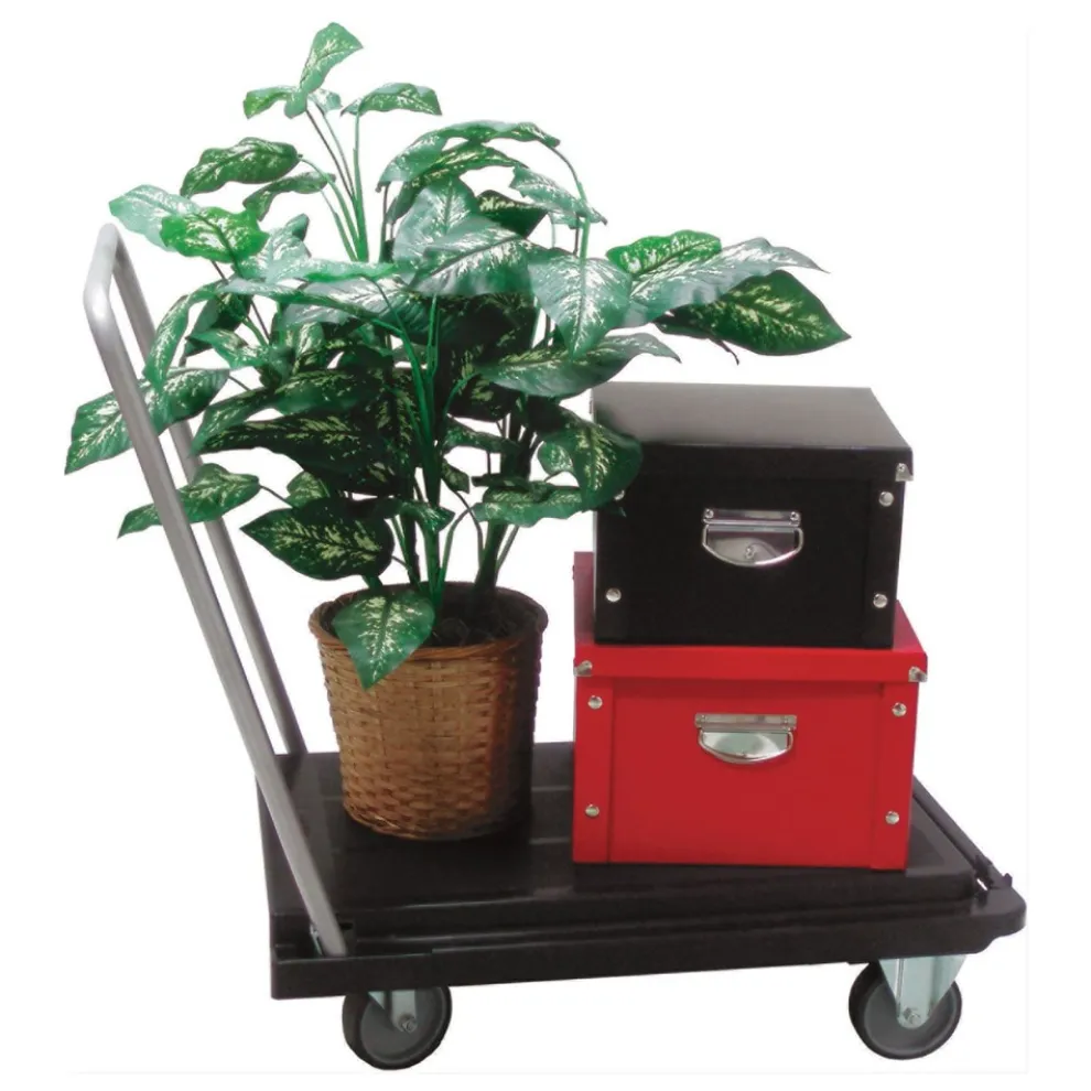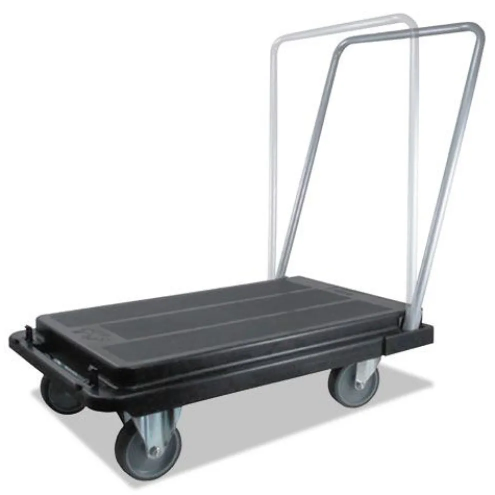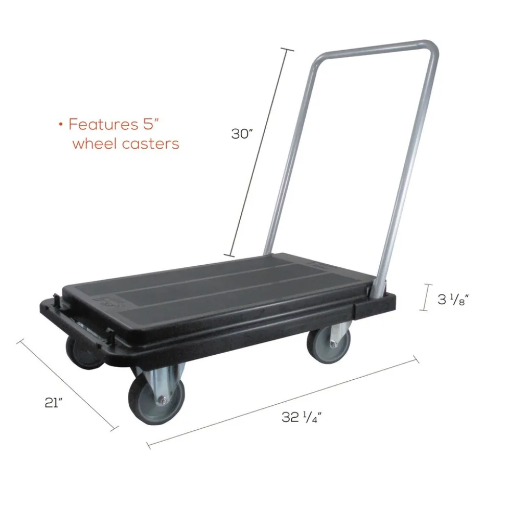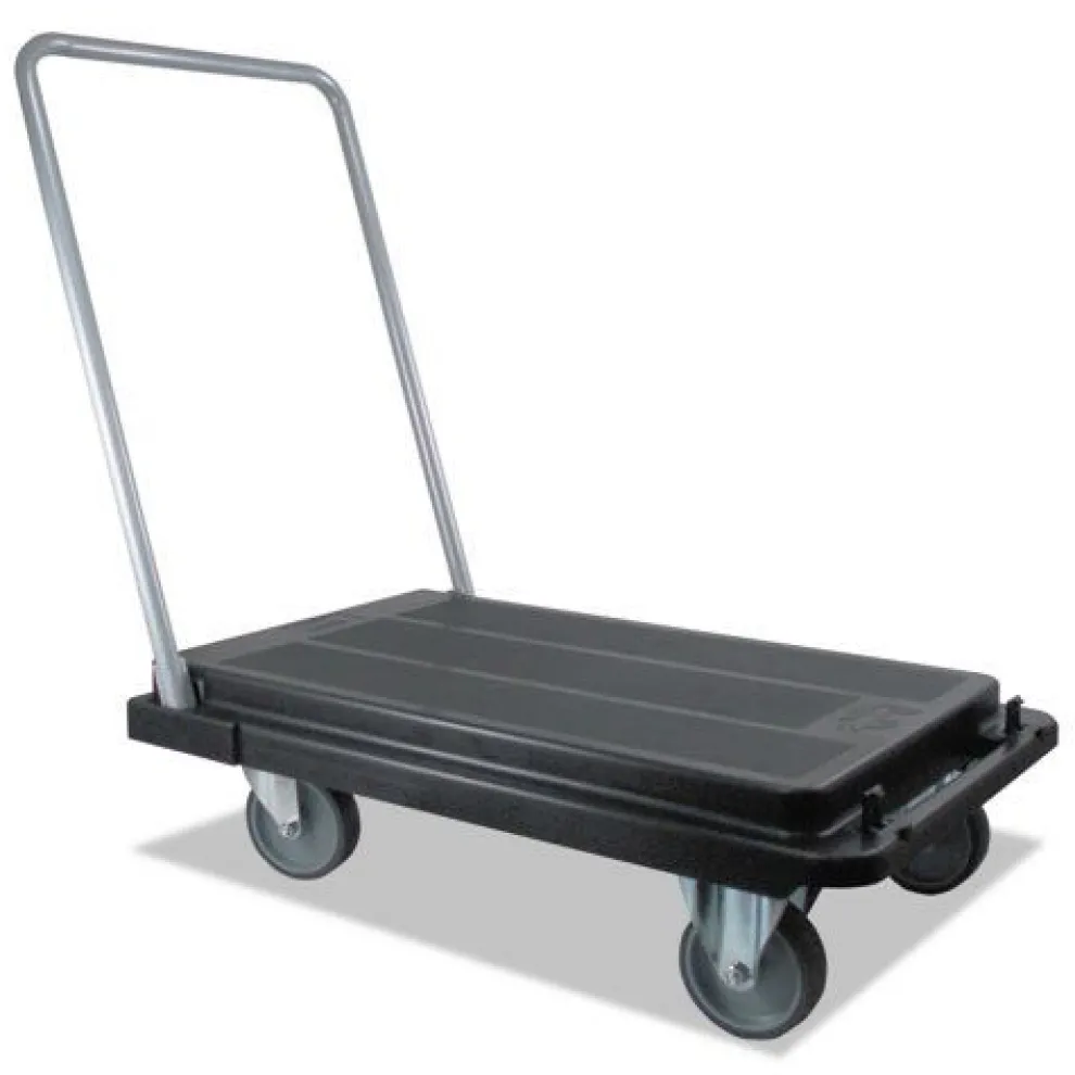 The Heavy Duty Platform Cart helps you transport heavy items without straining your back and provides extra strength and a smooth glide on any surface. Its steel three-position folding handle may be set perpendicular for pushing, angled back for pulling or laid flat for storage. The non-skid, impact-resistant polypropylene platform provides heavy-duty support and is designed to hold up to 300 pounds of supplies. Convenient molded strap ridges make tie down easy while non-marking wheels glide smoothly over carpet and tile. This rugged cart is designed to fit in tight places when not in use. Minimal assembly required.