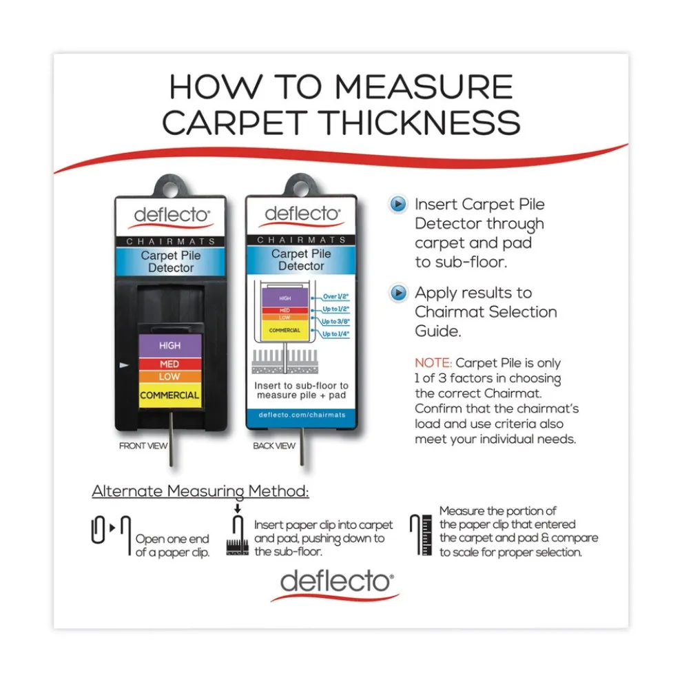 The SuperMat chair mat is a versatile choice for frequent use on carpets up to 1/2 in. thick and is well-suited for a variety of commercial and home office applications. Easy-glide rolling surface provides smooth chair movement to help minimize stress and strain on users back, legs and feet. Bottom studs grip the carpet securely and keeps the chair mat from moving. Deflecto’s Free and Clear non-orthophthalate, non-cadmium formula promotes a healthy work environment.