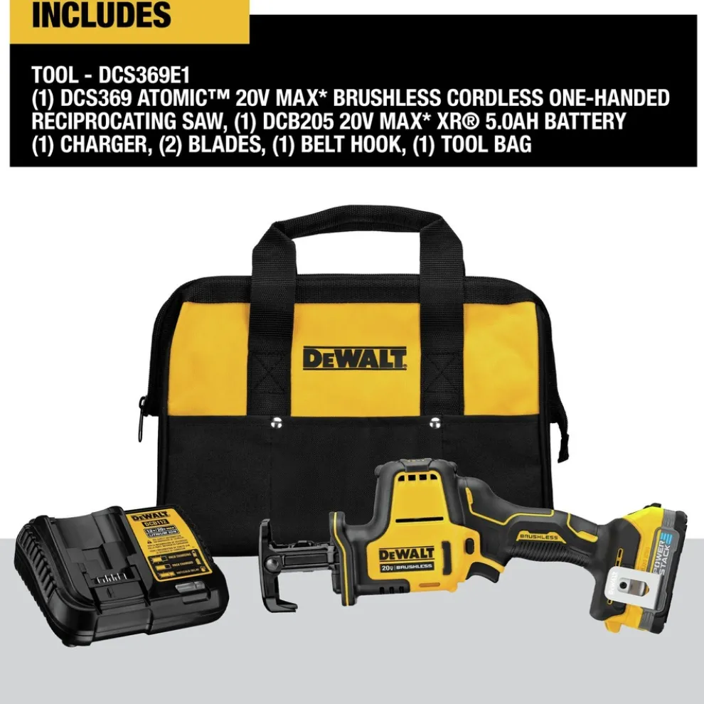 The DCS369, part of DEWALT’s ATOMIC Compact Series, is lightweight at only 3.13 lbs. and 37 percent lighter than the DCS367 Compact Reciprocating Saw (Tool Only). This saw is equipped with an LED light to help illuminate dark work spaces and provides up to 2,800 SPM to help get the job done. The pivoting shoe and variable speed trigger provide added control for a variety of jobs. This cordless kit includes our most powerful, most compact, and lightest weight 20V MAX battery with 50 percent more power, 25 percent more compact, and 15 percent less weight than the DCB203. The DEWALT POWERSTACK compact battery work with all DEWALT 20V MAX power tools and chargers.