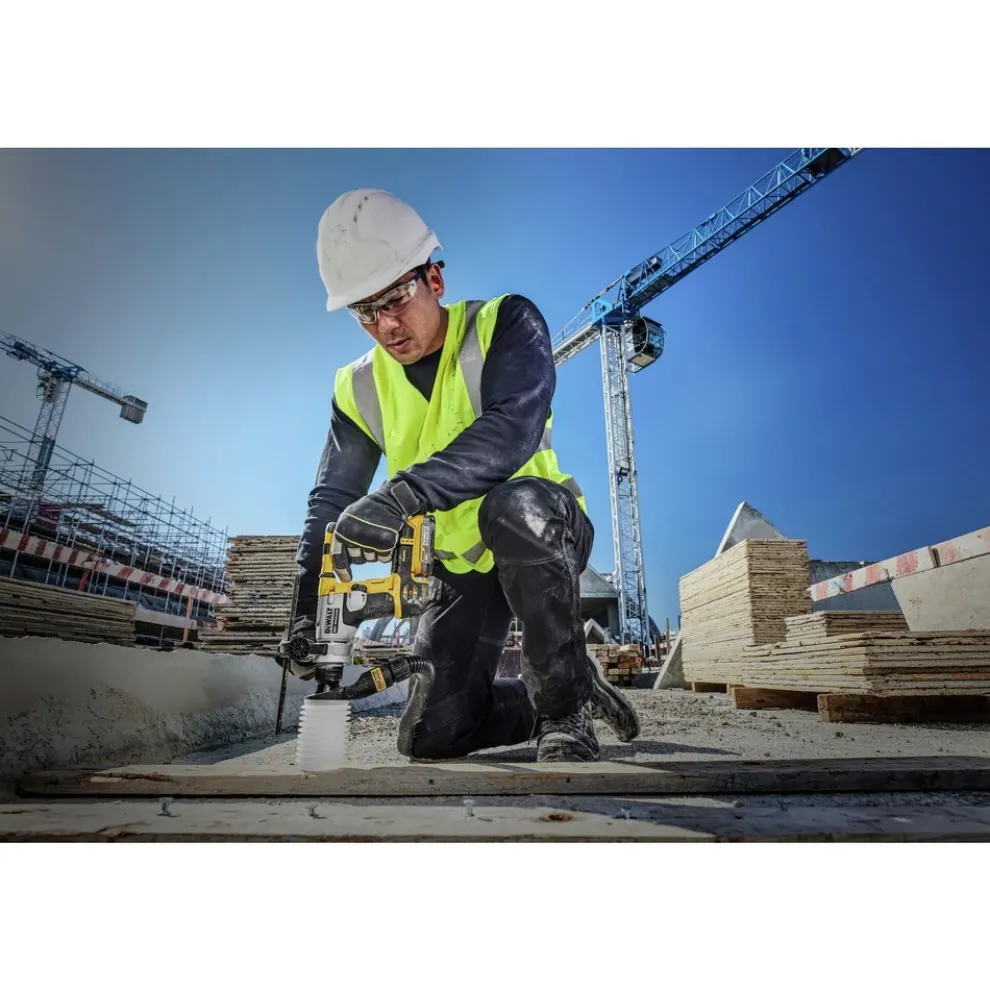 This 20V MAX SDS PLUS Rotary Hammer is a high performance drill powered by a DEWALT brushless motor and a durable German engineered mechanism, delivering 1.4 Joules of Impact energy. The lightweight and compact design makes this tool ideal for rod hanging, concrete forming, cable tray and strut mounting, railing mounting, clip and bracket mounting. It is part of the perform-and-protect product line, integrated with the Shocks Active Vibration Control System and becomes OSHA Table 1 Compliant when used with the DWH200D shroud and DWH161 dust extractor. It also has a removable belt hook. This cordless rotary hammer kit comes with 2 of our lightest and most powerful 20V MAX batteries with 50 percent more power, 25 percent more compact, and 15 percent less weight than the DCB203. The DEWALT POWERSTACK compact battery works with all DEWALT 20V MAX power tools and chargers.