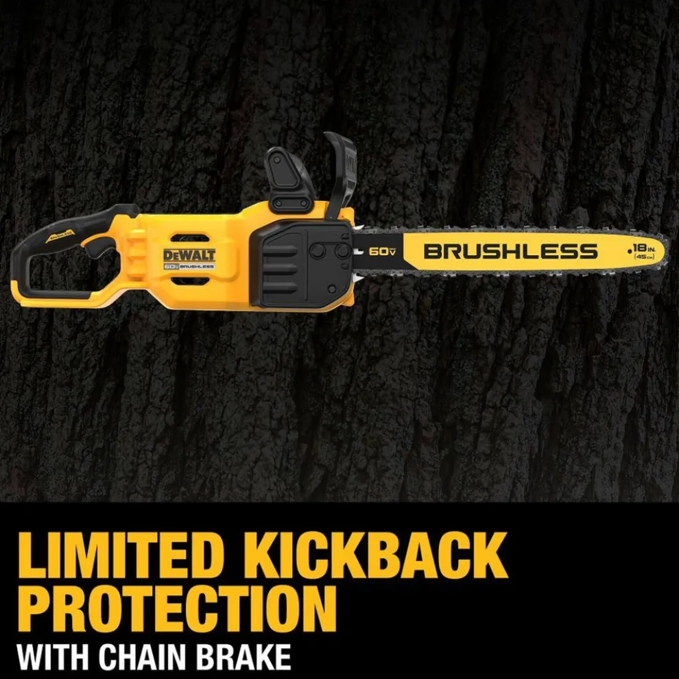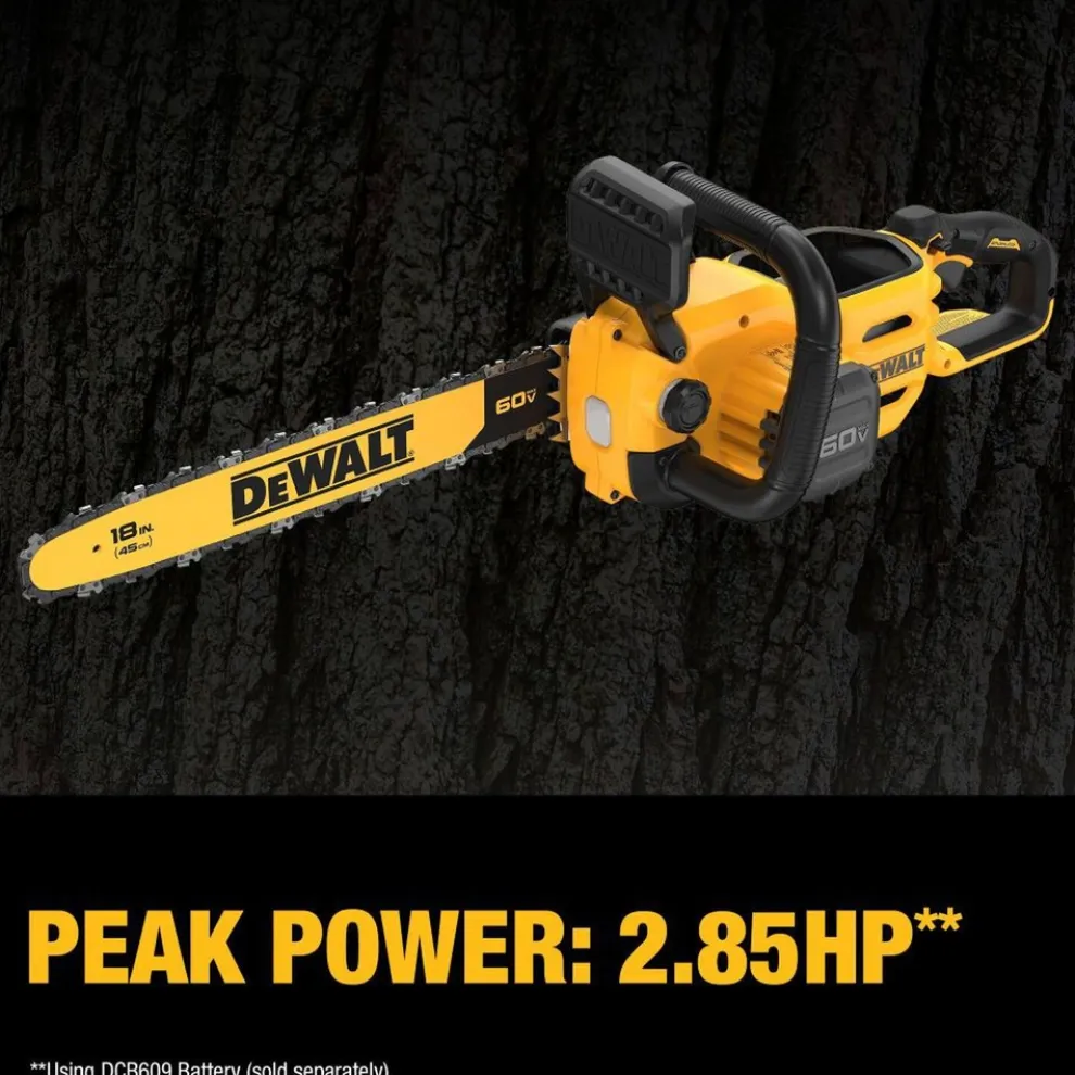 Tackle heavy-duty cutting, chopping, and sculpting with the 60V MAX Brushless Cordless 18 in. Chainsaw. This Chainsaw can handle challenging workloads with a peak horsepower of 2.85 HP using a DCB609 battery (sold separately) along with tooled chain tensioning for reliable bar retention. High efficiency and continuous lubrication are made possible by the professional-grade brushless motor and auto-oiling feature. This unit has a low kick back bar and chain for outdoor cutting applications and chain brake for added kick back protection.