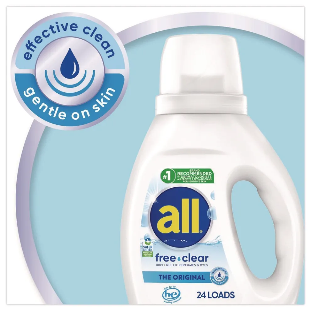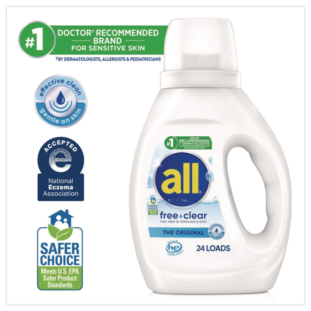 When it comes to laundry care for sensitive skin, all free clear HE liquid laundry detergent is the obvious choice. This hypoallergenic laundry detergent is the no. 1 recommended detergent brand by dermatologists, allergists and pediatricians for sensitive skin and Safer Choice certified. 100 percent free of perfumes and dyes. Use with all free and clear fabric softener and dryer sheets for clean and soft clothes with static cling reduction in the dryer. Great for small or large loads or for pre-treating stains before washing. Check an inseam for colorfastness. This unscented, fragrance-free detergent is safe to use in any washing machine including high efficiency (HE) and at any water temperature.