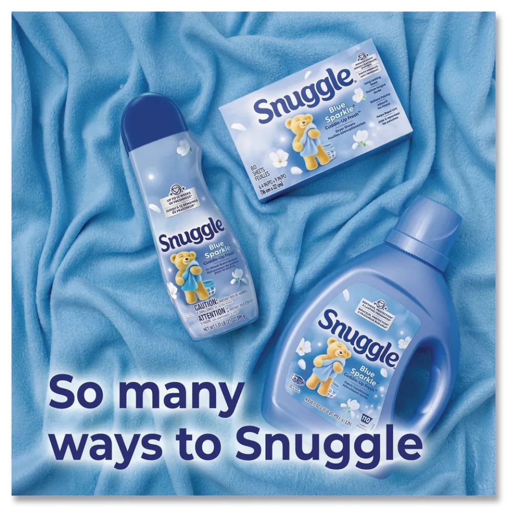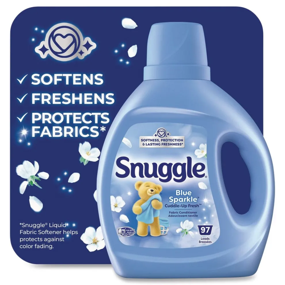 Bring the familiar comfort of home with you wherever you go, with Snuggle Blue Sparkle Cuddle-Up Fresh Liquid Fabric Conditioner. Add Snuggle softness and a long-lasting, familiar fresh scent to your favorite clothes with laundry softener liquid that softens fibers in fabric to make them feel cozy against your skin. Our Snuggle Blue Sparkle scent is a fresh and clean blend of white floral and bright green citrus notes, which snuggle up to warm, woody notes and a soft musk—fusing to create a comforting, long-lasting freshness. See how Snuggle Blue Sparkle liquid fabric softener gives your family’s laundry that little extra boost of softness, protection and a long-lasting fragrance. That’s the Snuggle Promise. Snuggle Liquid Fabric Softener helps protect against color fading.