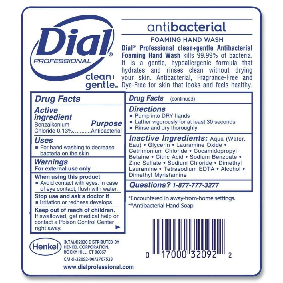 Dial Professional clean+gentle Antibacterial Foaming Hand Wash kills 99.99% of bacteria. It is a gentle, hypoallergenic formula that hydrates and rinses clean without drying your skin. Antibacterial, fragrance-free, dye-free for skin that looks and feels healthy. For use with Dial 1700 Manual Dispensers.