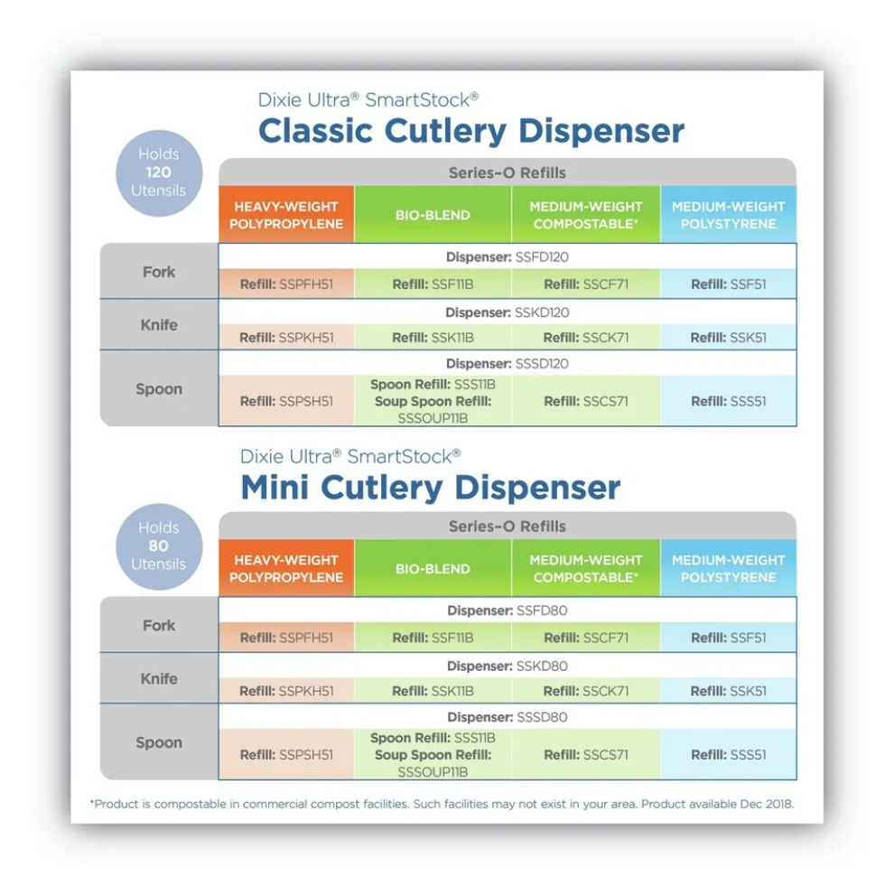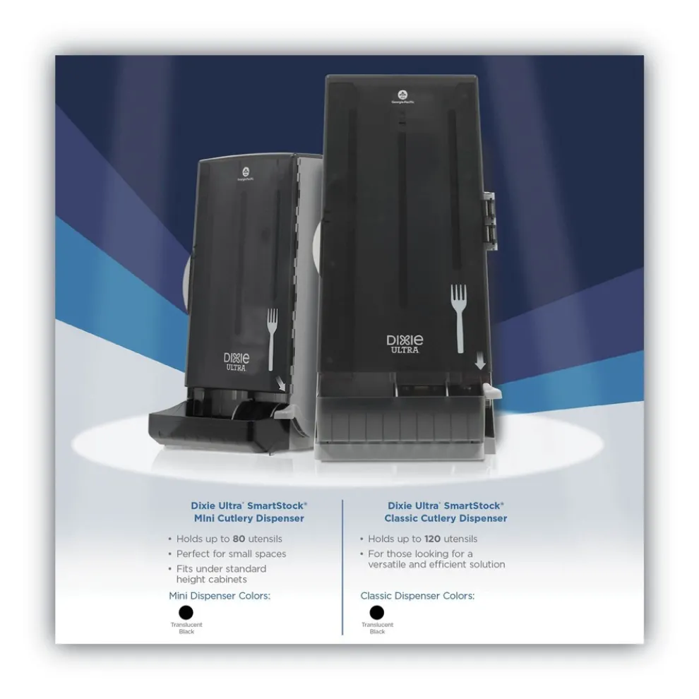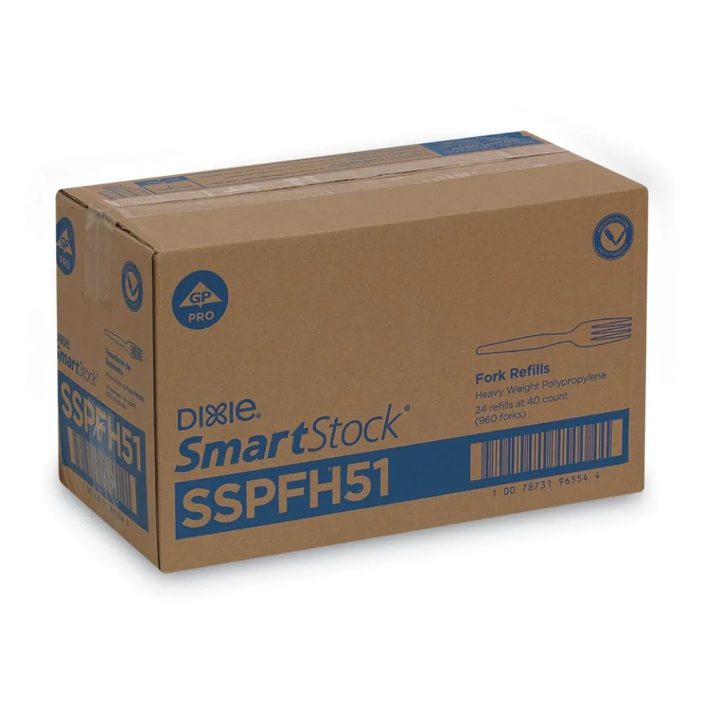 Pre-counted refill packs make restocking efficient and easy. For use with select SmartStock Cutlery Dispensers (sold separately). Sturdy cutlery provides reliable service. Sleek and efficient, Dixie Ultra SmartStock Plastic Cutlery Refills are ideal for Dixie Ultra SmartStock Dispensers.