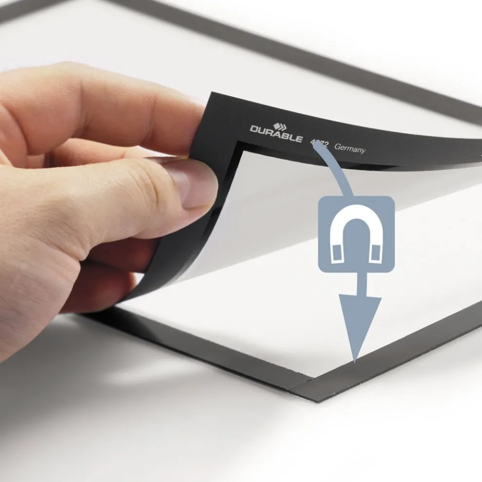 DURAFRAME Self-Adhesive Sign Holders from DURABLE are the go-to solution for effortless professional signage display. Easily showcase important information on windows, glass doors, or any smooth, solid surface with these dual-sided frames, instantly grabbing attention and effectively conveying your message right where you need it. The double-sided visibility displays two messages simultaneously for maximum impact. Perfect for storefronts, conference rooms, or any area where signage needs to be seen from inside and outside. Keep your messaging up to date with the innovative flip-up magnetic frame. This unique design means you can update promotions, announcements, safety information, or directional signage without any hassle. Simply lift the frame, swap out your content, and secure it back in place with the magnetic closure. This keeps your signage fresh, relevant, and engaging for your employees and customers. With no bulky mounting hardware or unsightly tape, these sign holders have a clean and modern appearance. DURAFRAME’s self-adhesive backing securely adheres to any smooth, solid surface, and can be repositioned without leaving behind any residue, giving you the flexibility to adjust your signage as needed. Tailor your signage to fit your unique space perfectly by placing DURAFRAME in portrait or landscape orientation. Ideal for fast-paced and high-traffic environments such as retail stores, restaurants, hotels, offices, warehouses, healthcare facilities, and manufacturing plants, DURAFRAME Self-Adhesive Sign Holders offer practicality and versatility for your signage needs.