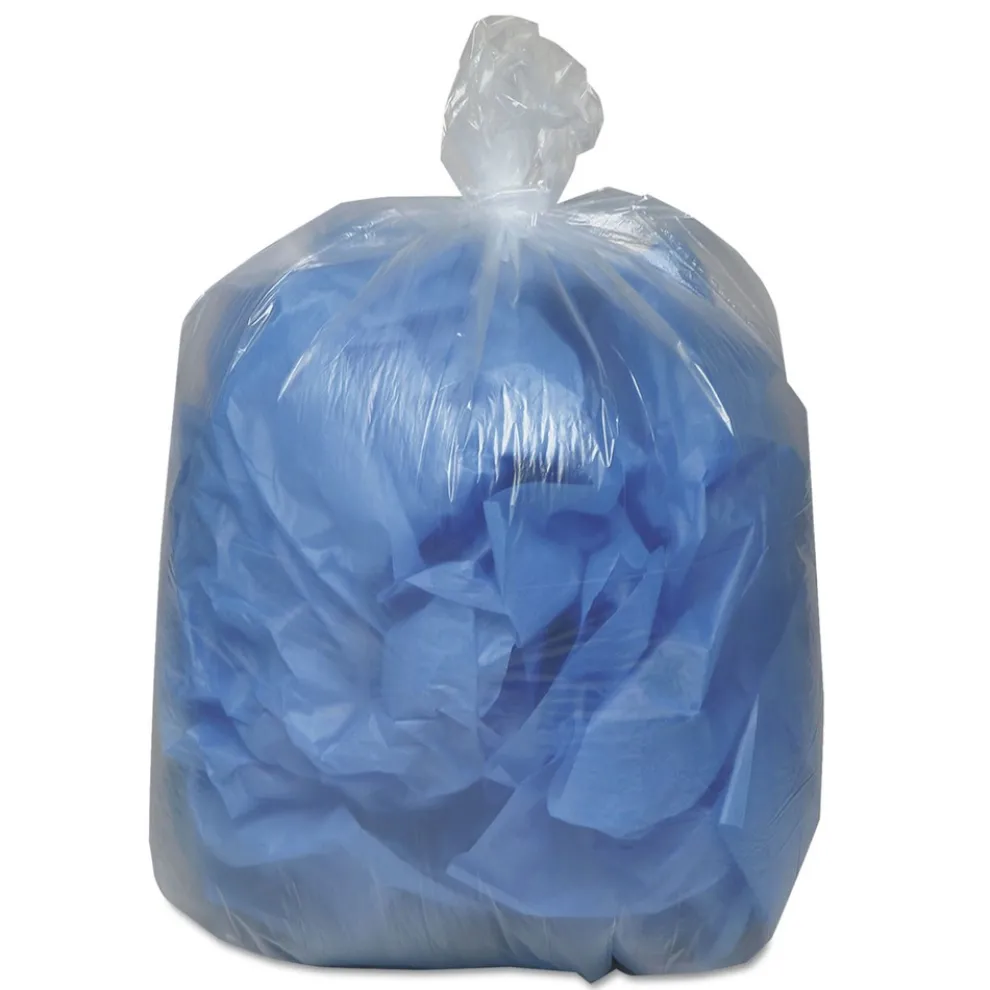 Clear liners are great for recycling and pilferage control. Heavy duty recycled content liners are suitable for all trash applications. Star bottom seal construction distributes weight more evenly and resists leaks. Coreless rolls for convenient dispensing. Ideal for state and local municipalities mandating recycled content products.