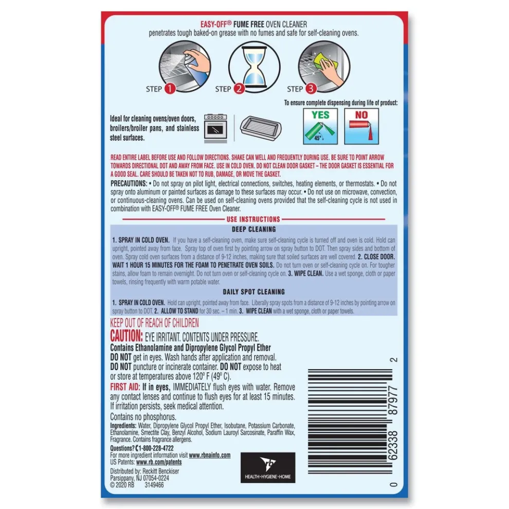 Destroy tough, baked-on grease fast and without the fumes using EASY-OFF Fume Free Oven Cleaner. Give cleaning crews a formula they can use without gloves and during operating hours to clean ovens, oven doors, broilers, broiler pans and stainless-steel surfaces. Simply spray, wait 30-60 seconds, and wipe away for an effective daily spot clean or leave it on longer for deeper cleaning. Cover both daily upkeep and longer oven cleans with the fume-less formula that leaves a pleasant scent. Safe for self-cleaning ovens.