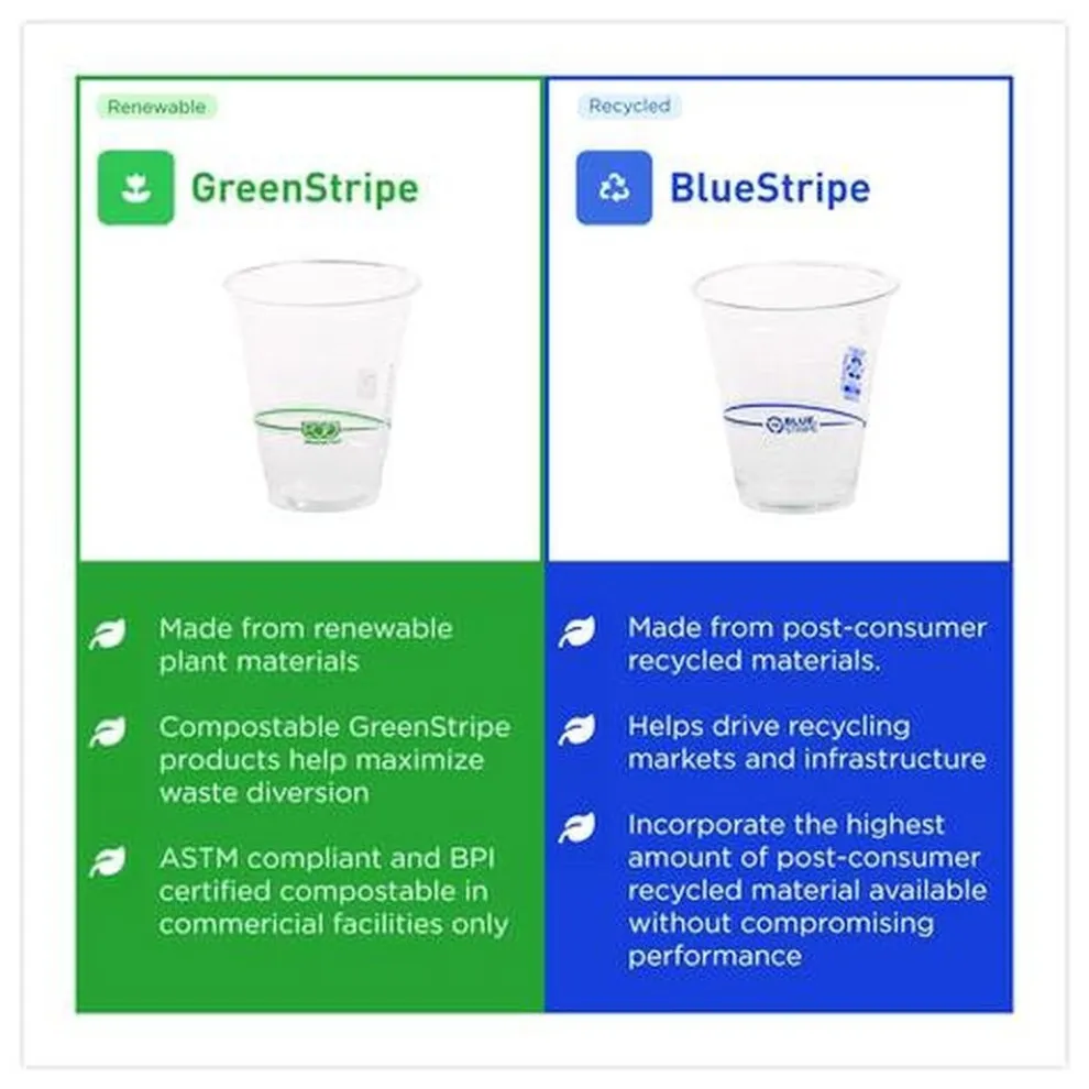 GreenStripe cold cups are perfect option for water, juice, or other cold drinks. Showcase your commitment to sustainability with our classic GreenStripe cold cups. Made from PLA, a plant-based plastic, these cups are renewable and compostable. They’re made from crops that grow back every year, and they can be composted commercially (where facilities exist) and returned to the soil to help new plants grow. Compatible flat- and dome-lid options (sold separately) allow you to use the same cup type for both cold and frozen drinks. They’re BPI certified compostable and ASTM compliant.