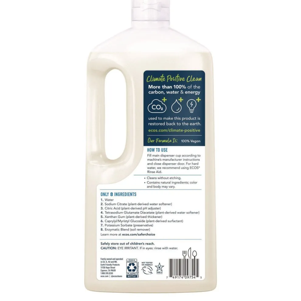 This high-performance, 100 percent vegan dishwasher formula melts away grease and leaves dishes looking spotless. Give your dishes, glasses, and silverware a safer, sustainable, sparkling clean with this plant-derived formula. This dishwasher gel is effective at cleaning tableware and kitchen tools without etching. No dyes or scents; great for customers with highly sensitive skin or allergies. Made without parabens, phosphates, and phthalates. Use with confidence in any dishwasher. Not tested on animals. Manufactured in a facility that is LEED Zero Carbon, LEED Zero Waste, and LEED Zero Energy Certified.