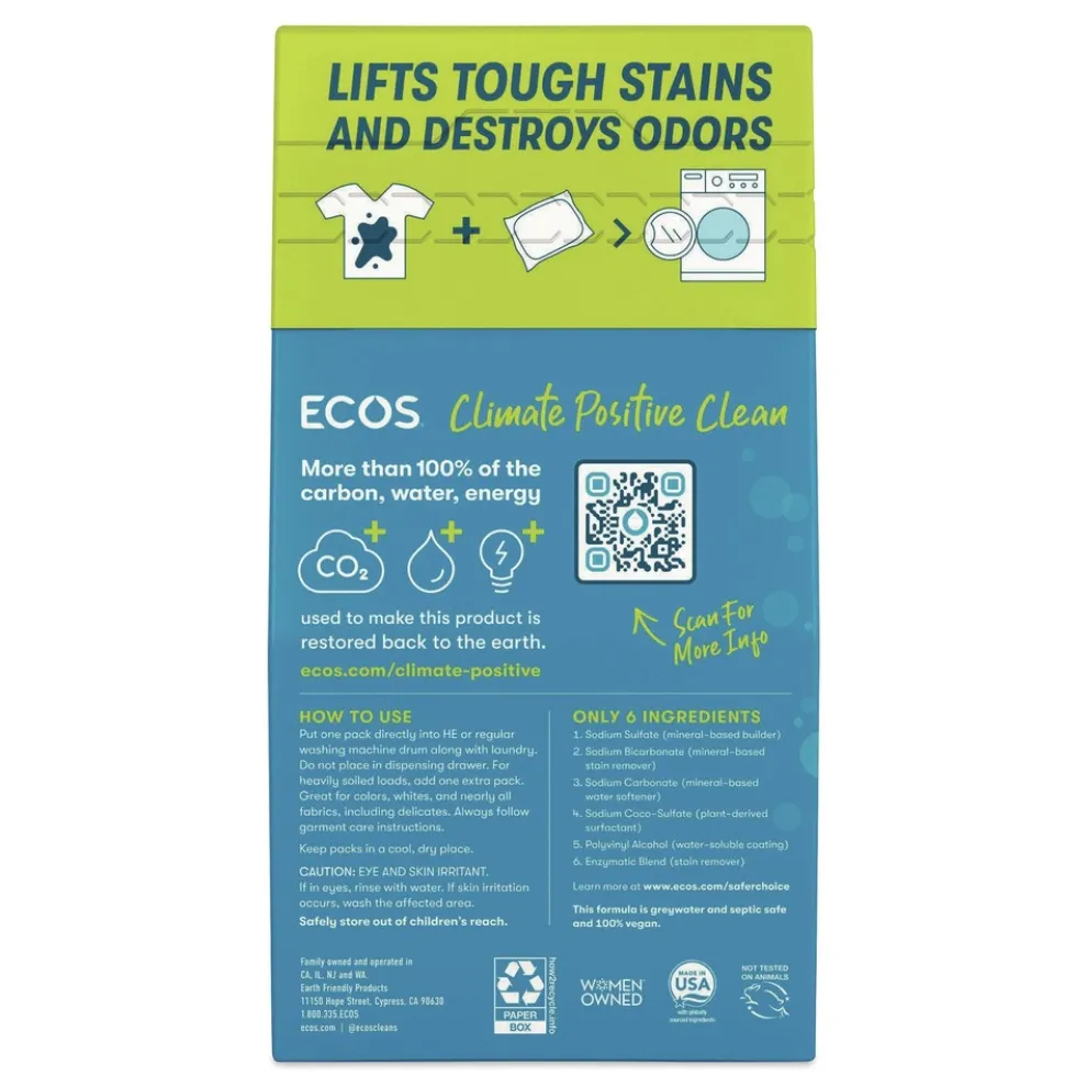 Redefining convenience, these sustainable, all-in-one laundry packs make washing a breeze. Our advanced, plant-powered formula harnesses the natural cleaning power of enzymes, which penetrate deep into fabric fibers to break down and eliminate stubborn stains, ensuring a thorough and effective clean with every wash. Say goodbye to sticky spills and hoisting heavy jugs, and elevate your laundry experience with ECOS the sustainable, convenient, and highly effective solution you’ve been searching for. Works well with all washing machines, temperatures, and cycles. 100 percent plastic free packaging reduces plastic waste, contributing to a sustainable future. Not tested on animals. Manufactured in a facility that is LEED Zero Carbon, LEED Zero Waste, and LEED Zero Energy Certified.