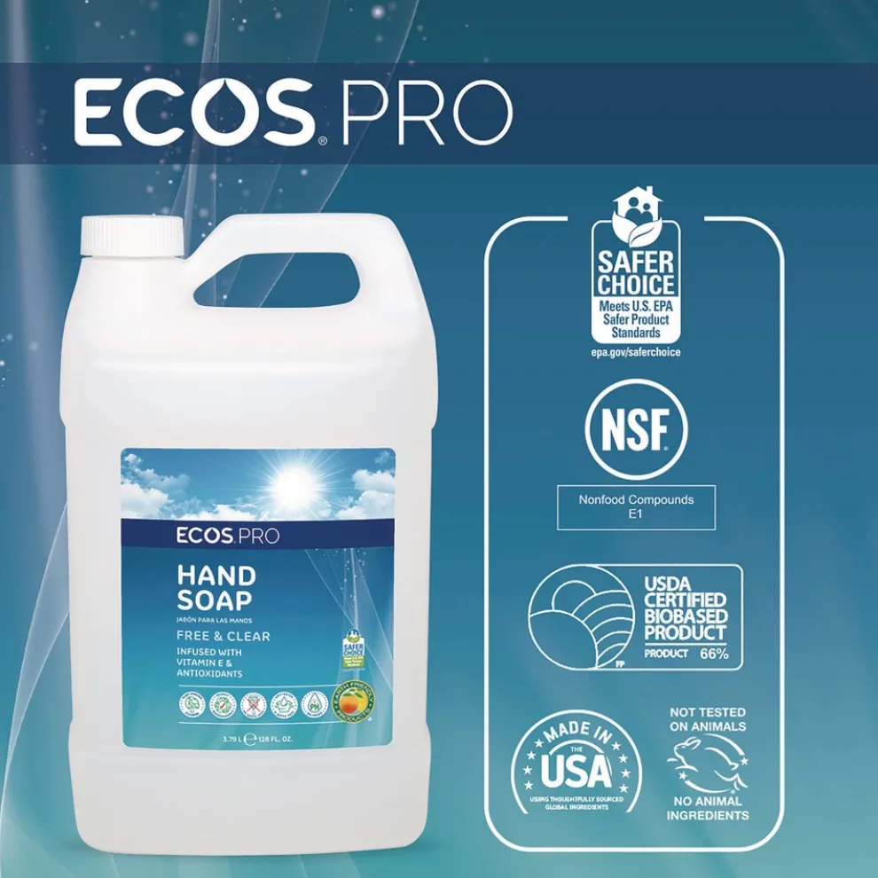 ECOS PRO liquid hand soap is a better choice for your hands. The crystal clear plant-powered formula is specifically designed to lift dirt and grease, while being gentle enough for even the most frequently washed hands. Infused with nourishing vitamin E and antioxidants to moisturize and protect hard-working hands. The pH-balanced formula is made using sustainable, plant-powered ingredients. Made without dyes and never tested on animals, it is also gray water and septic safe.