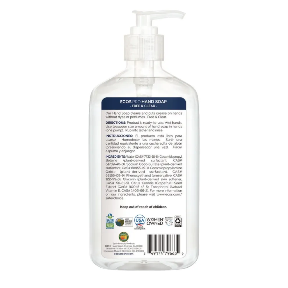 ECOS PRO liquid hand soap is a better choice for your hands. The crystal clear plant-powered formula is specifically designed to lift dirt and grease, while being gentle enough for even the most frequently washed hands. Infused with nourishing vitamin E and antioxidants to moisturize and protect hard-working hands. The pH-balanced formula is made using sustainable, plant-powered ingredients. Made without dyes and never tested on animals, it is also gray water and septic safe.