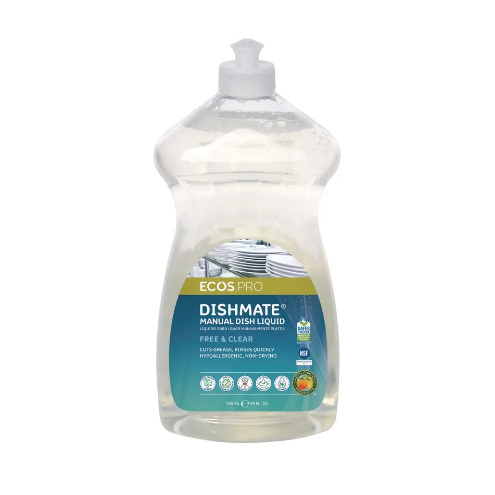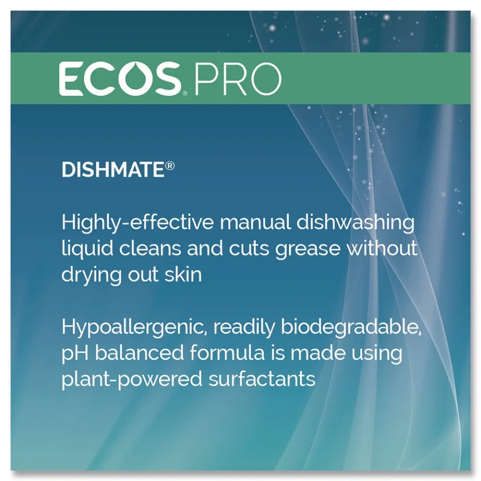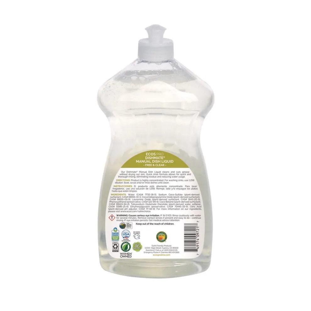 This highly effective ECOS PRO Dishmate manual dishwashing liquid cleans and cuts grease without drying out skin. The unique formulation leaves less residue on dishes for a quicker rinse time and reduction in water usage. The hypoallergenic, pH-balanced formula is made using sustainable, plant-derived surfactants. The product is free of dyes and is gray water and septic safe. Not tested on animals. Manufactured in a facility that is LEED Zero Carbon, LEED Zero Waste, and LEED Zero Energy Certified.