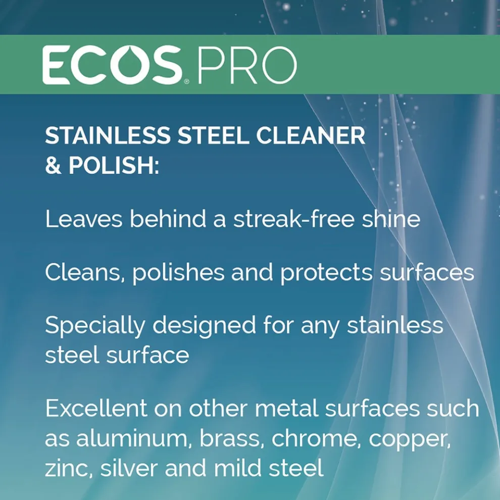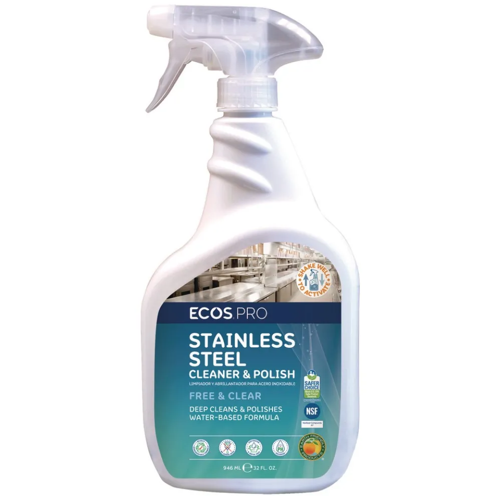 The ECOS PRO reliable and effective water-based formula cleans, polishes, and protects stainless steel surfaces. The cleaner will not leave streaks, hazing, or oily residues behind. Protects against water spots and fingerprints and formulated to perform without harsh fumes. Excellent on other metal surfaces such as aluminum, brass, chrome, copper, zinc, silver, and mild steel. The pH-balanced formula is made using sustainable, plant-powered ingredients, is free of dyes, and is gray water and septic safe. Not tested on animals. Manufactured in a facility that is LEED Zero Carbon, LEED Zero Waste, and LEED Zero Energy Certified.