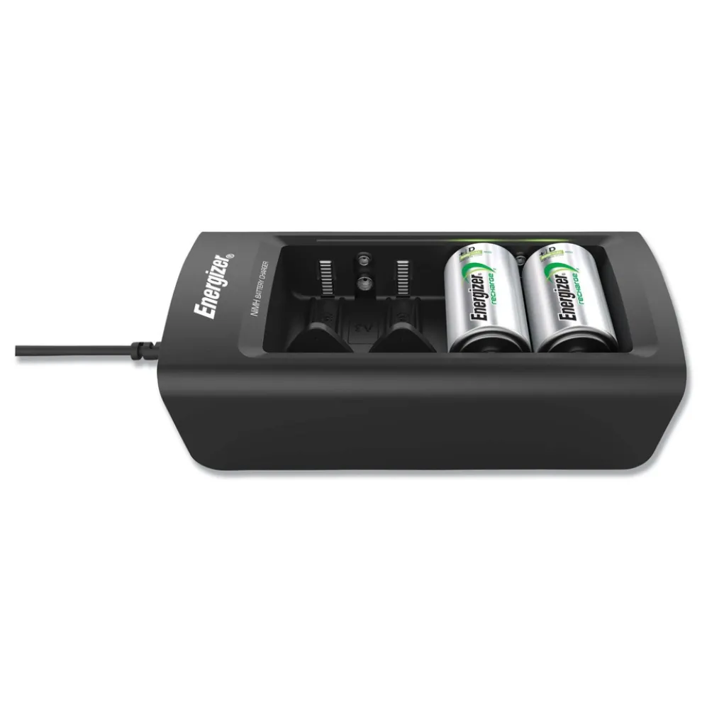 The easy way to keep all your rechargeable batteries juiced. The Energizer Universal Charger is designed for range, charging standard rechargeable battery sizes big and small—from AAA to 9V NiMH—without the need for multiple charging devices. Its LED light bar status indicator updates you in real time when charging is complete. Helps maximize battery performance; this charger automatically shuts power off to the circuit once it detects batteries are fully charged. With a multitude of safety features, like bad and primary battery detection, reverse polarity protection, and a timer that prevents overcharging—you get a reliable and worry-free charge time after time. So whenever a device runs out of juice, from game controllers to TV remotes to flashlights and toys, know you can trust the long-lasting performance and intuitive charging power of Energizer Recharge. Charges: 2 or 4 AAA, AA, C, or D, or 1 or 2 9 Volt. Compatible with all NiMH rechargeable batteries.