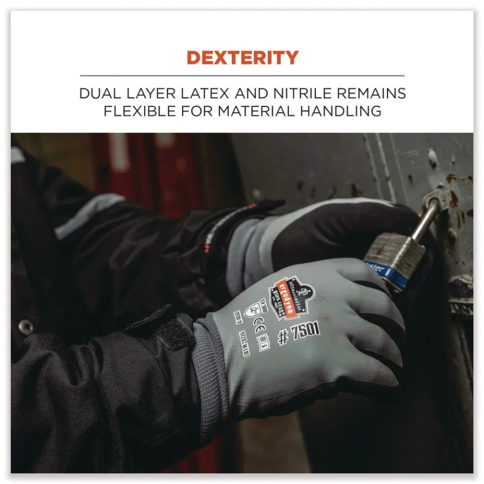 The ProFlex 7501 Coated Winter Work Gloves are dual layer for warm, waterproof protection in cold temperatures. Wet hands are cold hands. These coated gloves feature a full waterproof latex dip that protects you from the elements by keeping water and cold air out, with a second layer of sandy nitrile on the palms for abrasion-resistance and enhanced grip without compromised dexterity. A polyester liner with soft brushed acrylic fleece provides two levels of thermal protection. A double-lined interior, 15 g polyester topped with 10 g of brushed acrylic fleece, keep hands toasty and comfortable without bulk. These waterproof work gloves meet the EN388 standard for cut resistance. They are ideal for work in cold wet environments, including material handling and construction.