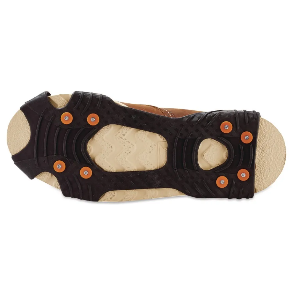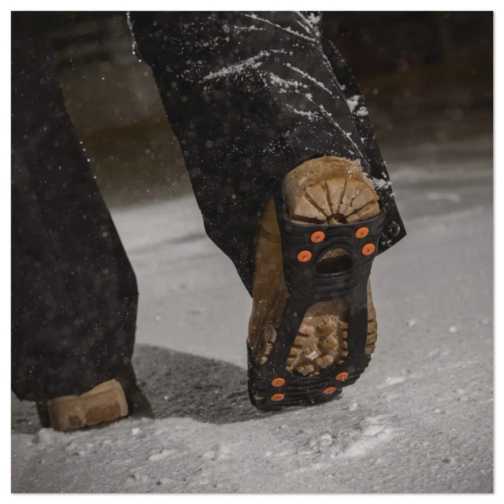 The TREX 6300 Slip-On Ice Cleats are lightweight ice grips for boots with eight replaceable spike grips and one-piece design for a snug fit over winter boots to prevent slip and fall injuries on the ice. These ice cleats provide tenacious traction and extra stability on ice and snow. These ice grippers feature eight rugged carbon steel cleats on the ball and heel of foot for grip on slippery terrain. These will fit over any style of boot or shoe for traction and stability during winter work or other winter outdoor activities. Tested to be flexible in temperatures down to -40F (-40C), the stretchable rubber material provides a secure fit and easy slip-on/off wear. These snow cleats are lightweight and can be folded small enough to be stored in a pocket or pack when not being worn. Stretchy design means no tightening or adjustments needed and should fit snugly on your boot or shoe. Use your shoe/boot size to determine the approximate size.