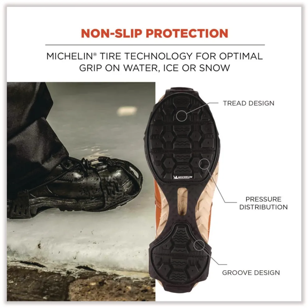 TREX Spikeless Traction Devices for shoes reduce the risk of slips and injuries by providing spike-free traction on slick surfaces. Powered by Soles by Michelin, these are the industry’s most advanced spikeless traction device. Designed for work environments where spiked ice cleats are not preferred, these shoe and boot grips make for easy and safe transition between indoor and outdoor. To achieve traction without spikes, the treads are constructed with a Michelin ice control compound, the same innovative technology found in their winter driving tires. Strategically placed grooves allow for efficient water evacuation when pressure is applied. Preventing water build-up is particularly beneficial on smooth indoor surfaces. Micro-pumps increase adhesion by properly distributing pressure to maintain high surface contact on icy surfaces. The tread is designed with block springs that create additional surface area for increased grip on snowy surfaces.