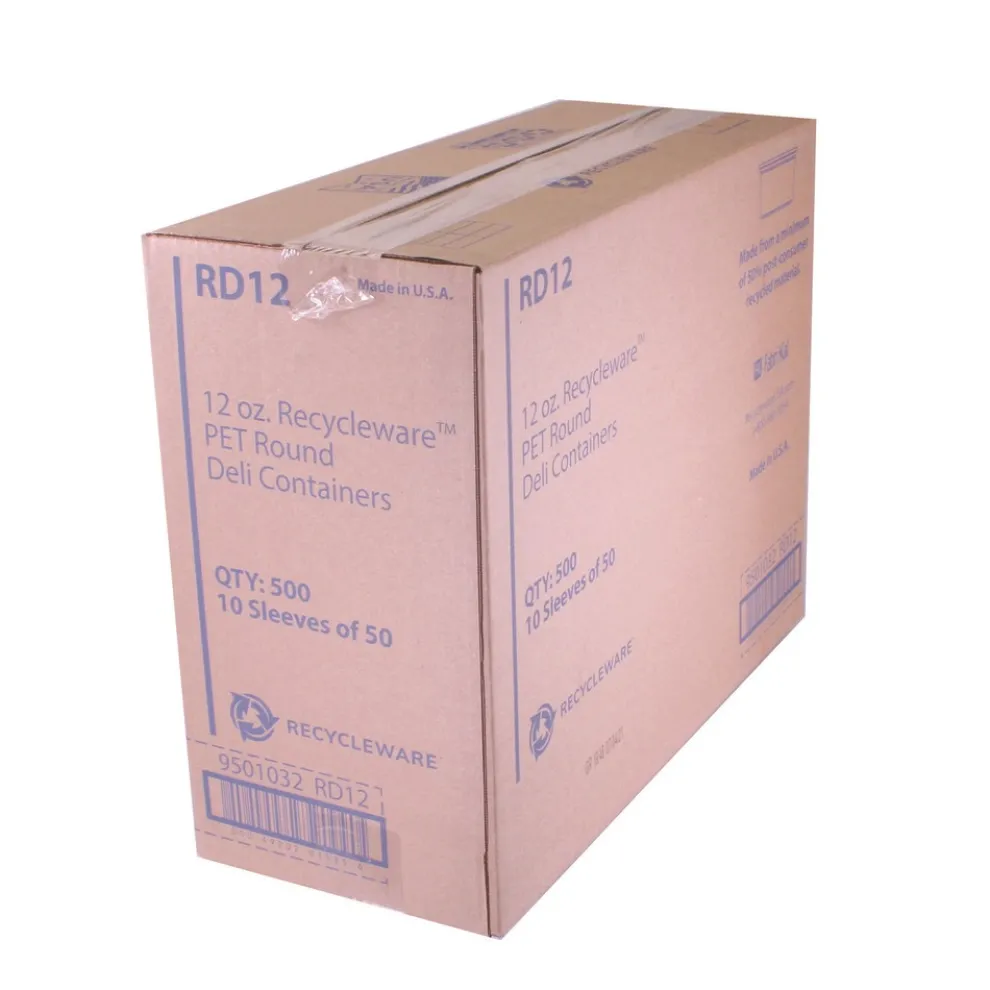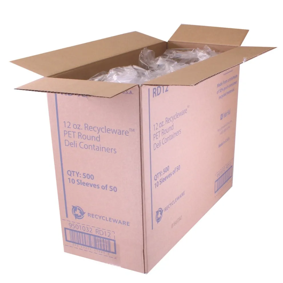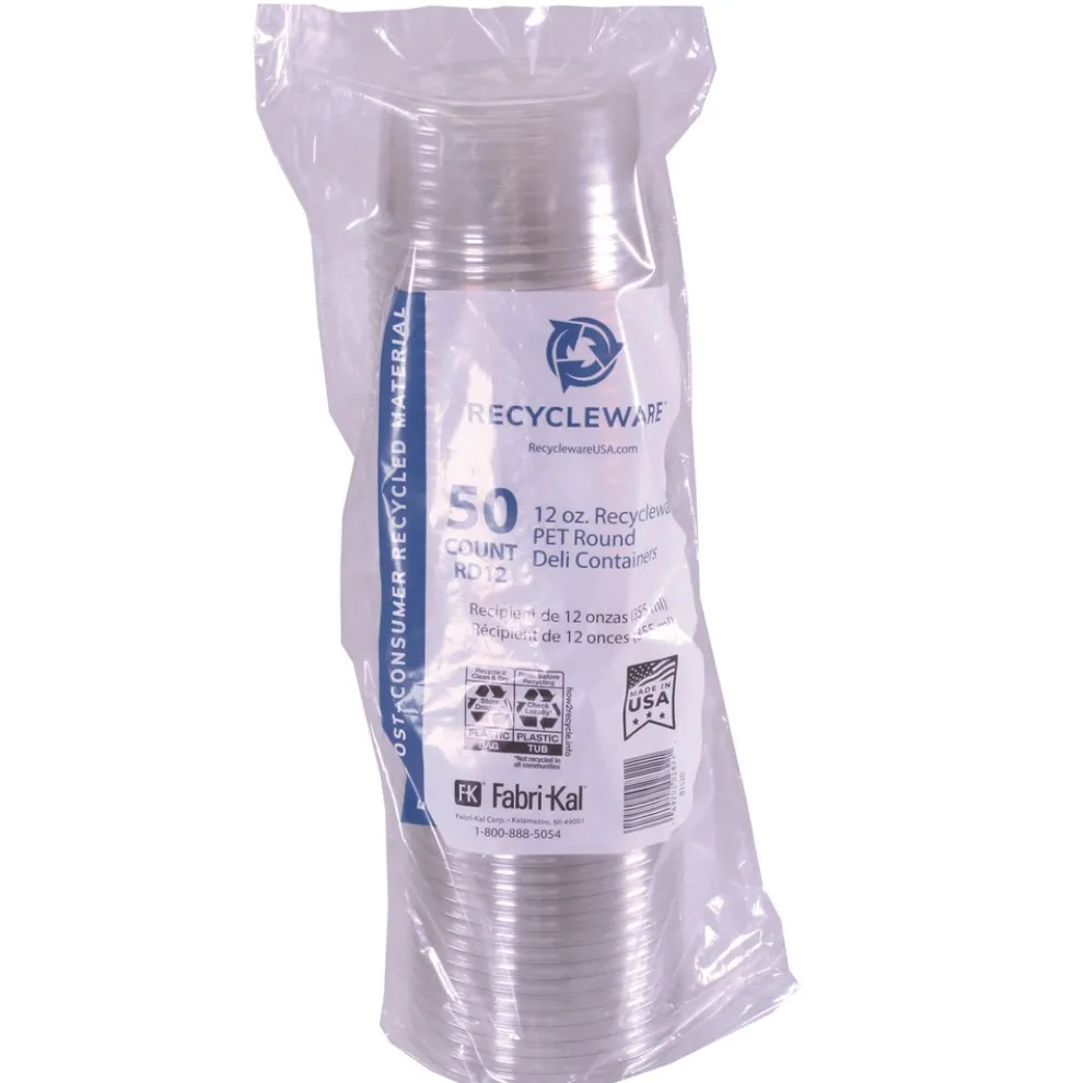 Made from recycled (PCR) PET plastic bottles. The recycled PET material performs well in cool temperature applications and is crack resistant. Durable and leak-resistant. Stylish and crystal-clear for complete product visibility. Paired with Recycleware Deli Container Lids, provides a snap fit lid application and removal.