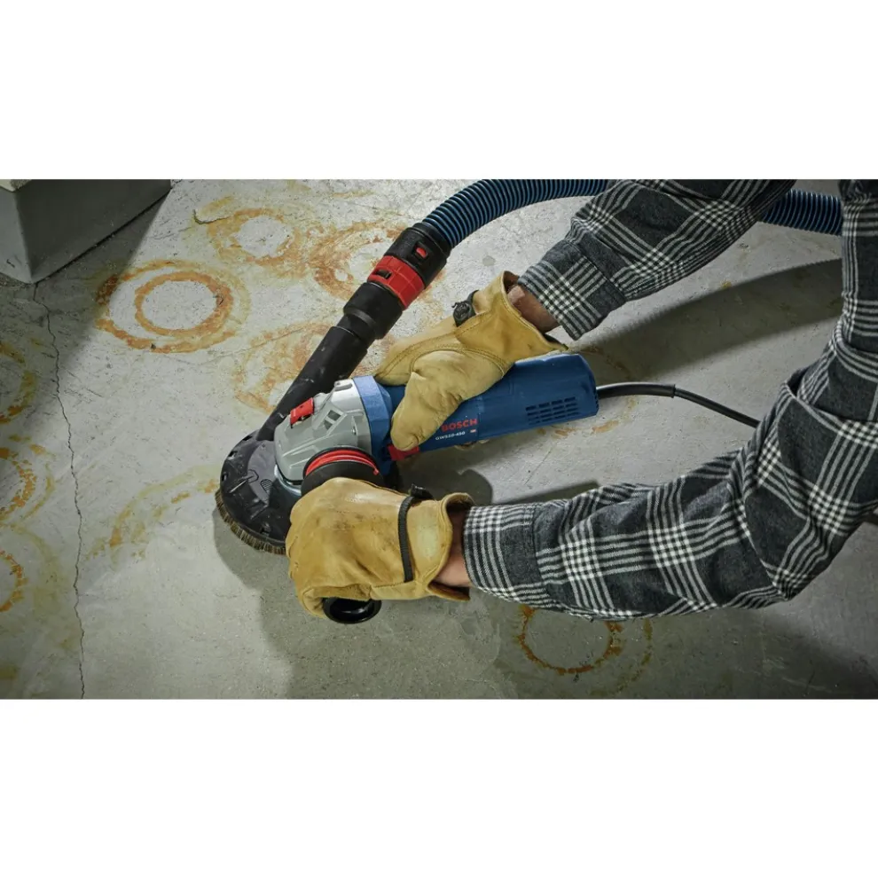 This 4-1/2 In. ergonomic angle grinder features a narrow grip zone for all-day comfort and control, combined with a powerful 10 Amp motor. The Bosch GWS10-450PD-RT Angle grinder delivers results, producing up to 11000 No-load rpm for maximum productivity in grinding and cutting applications. The tool weighs 4.6 Lbs. It features a multi-grip paddle switch, which provides increased grip options for better ergonomics, comfort and control. The paddle switch has a no-lock-on feature that shuts the motor off after the switch is released. Equipped with epoxy-coated field windings, double-sealed bearings and direct-motor cooling, this grinder is built for a longer tool life. It features spiral bevel gears for smooth transmission of power. For added convenience, it has an anti-vibration side handle and an adjustable tool-free guard with multiple fixed-adjustment settings to allow the user to position the guard in a variety of working angles. It has an updated gearhead mounting collar, which is now compatible with all Bosch metal and concrete guards.