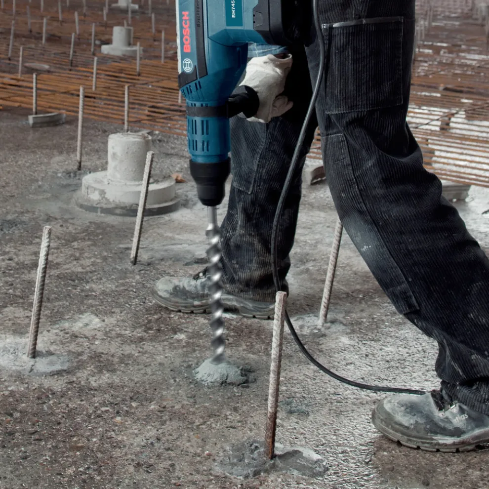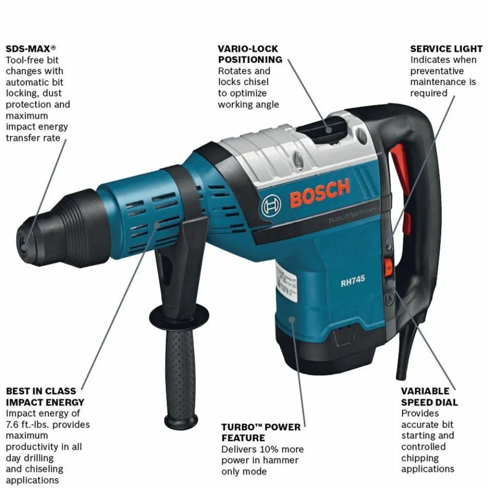 The Bosch RH745 1-3/4 in. SDS-Max Rotary Hammer features best in class drilling and chiseling performance with 7.6 ft-lbs. impact energy (EPTA). The hammer features 2 modes of operation: rotary hammer or hammer-only and a variable speed dial for controlled drilling and chiseling applications. The tool also features the vario-lock function which allows the chisel to be rotated into 12 different positions to optimize the working angle when used in hammer only mode.