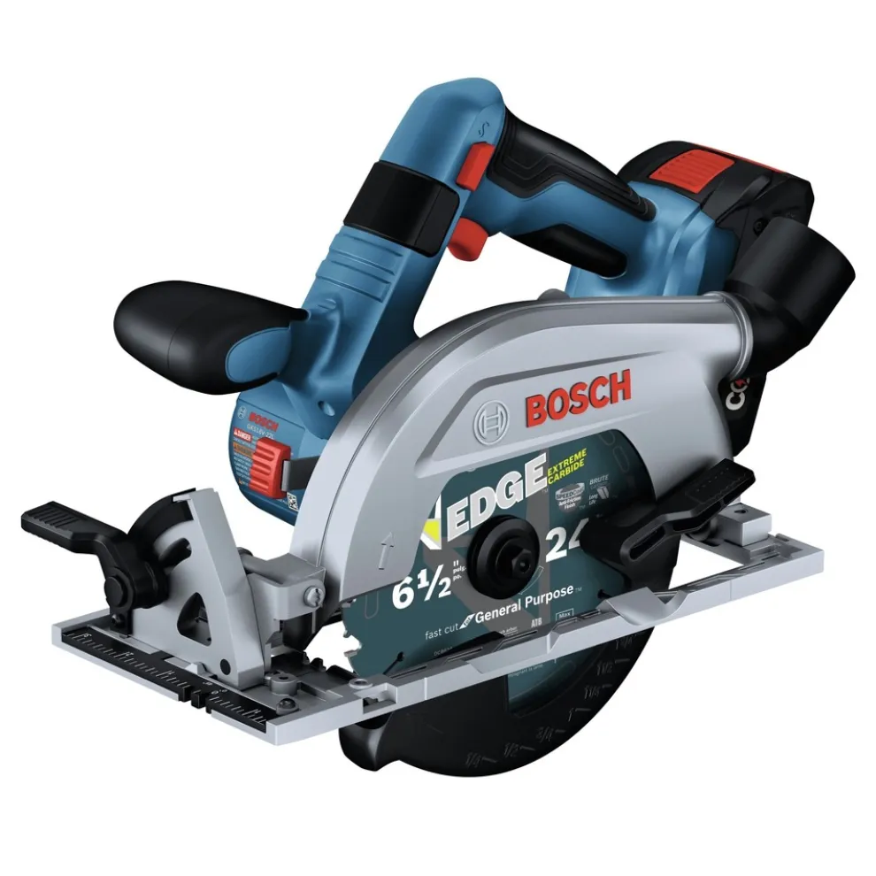 This circular saw has a 2-1/4 in. cut capacity, cutting through 2x (“2 by”) material across the entire bevel range. The Bosch GKS18V-22L 18V Blade-Left 6-1/2 in. Circular Saw has a brushless motor, which delivers efficient runtime and 5,000 RPM with professional dependability. This compact saw weighs only 6.1 lbs. (tool only, not including battery). The saw’s blade left design provides a cleaner view of the blade for better cut-line visibility when held in the right hand. When held in the left hand it provides great balance and control for cross cuts. The auxiliary handle improves stability and ergonomic handling in either hand. The saw’s convenient depth gauges are visible from either side of the saw and it has a 0-50 degree bevel range, with detents at 0, 45 and 22-1/2 degrees. It features 2 convenient depth gauges, one on the lower guard and one by the housing so depth is visible on either side of the saw. It has an electronic convenience brake for less downtime between cuts. The 360 degree pivoting dust port directs dust away from the body when the saw is held in either hand. This saw also features a cut-line LED to illuminate workpiece cutting area for improved cut-line visibility. It includes an on-board blade-change wrench and spindle lock for easy blade changes. The kit features (2) CORE18V 4 Ah Advanced Power Batteries, which each delivers 2x the runtime compared to previous generation BAT612 2 Ah battery.
