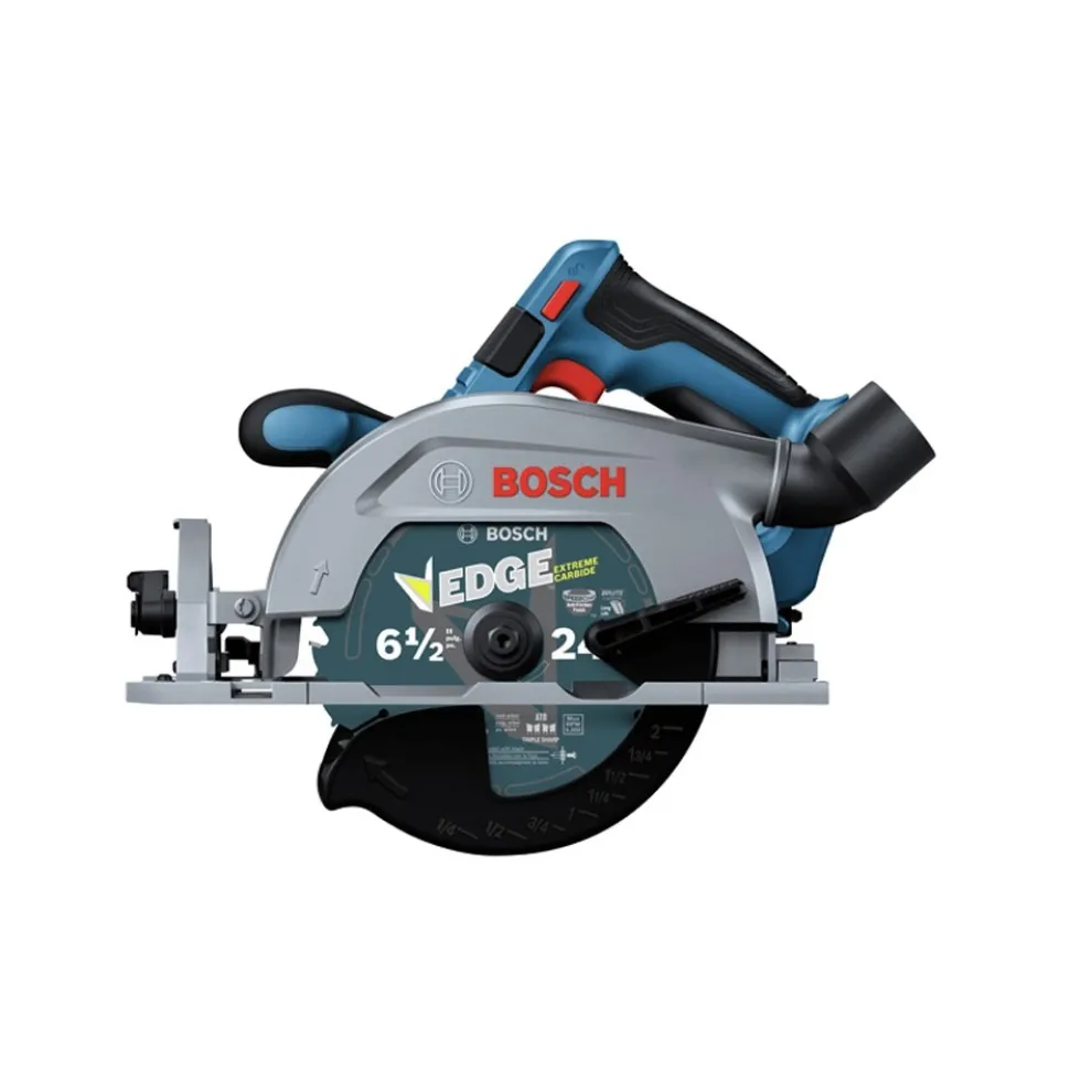 This circular saw has a 2-1/4 in. cut capacity, cutting through 2x (2 by) material across the entire bevel range. The Bosch GKS18V-22L 18V Blade-Left 6-1/2 in. Circular Saw has a brushless motor, which delivers efficient runtime and 5000 RPM with professional dependability. This compact saw weighs only 6.1 lbs. (tool only, not including battery). The saw’s blade-left design provides a cleaner view of the blade for better cut-line visibility when held in the right hand. When held in the left hand it provides great balance and control for cross cuts. The auxiliary handle improves stability and ergonomic handling in either hand. The saw’s convenient depth gauges are visible from either side of the saw and it has a 0-50 degree bevel range, with detents at 0, 45 and 22-1/2 degrees. It features 2 convenient depth gauges, one on the lower guard and one by the housing so depth is visible on either side of the saw. It has an electronic convenience brake for less downtime between cuts. The 360 degree pivoting dust port directs dust away from the body when the saw is held in either hand. This saw also features a cut-line LED to illuminate workpiece cutting area for improved cut-line visibility. It includes an on-board blade-change wrench and spindle lock for easy blade changes.