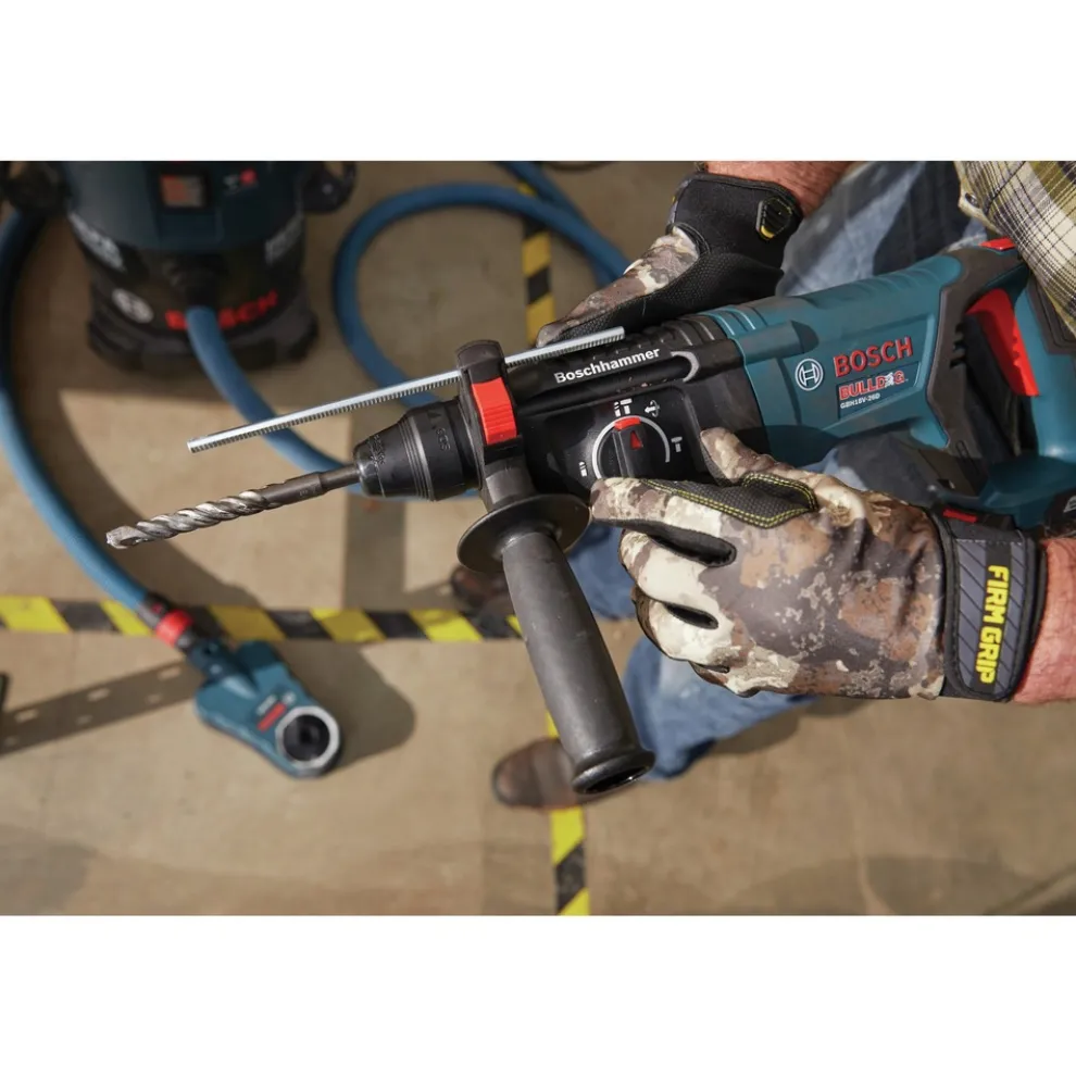 This Bosch D-handle Bulldog hammer consistently outperforms the best-selling 1 in. corded 11255VSR Bulldog, making it better than the best. The GBH18V-26DK24 18V EC Brushless 1 in. SDS-Plus Bulldog Rotary Hammer Kit features a hammer that delivers 1.9 ft-lbs. of impact energy, based on the industry standard of measurement agreed upon by the European Power Tool Association (EPTA). It weighs only 5.8 lbs. (tool only, not including battery), delivering superior performance and an outstanding impact-to-weight ratio. The kit features 2 CORE18V High Power Batteries, which deliver 2x the power and runtime as 2-layer 4 Ah batteries with minimal increase in volume and weight. They are engineered with 21700 cell technology. Bosch engineered the exclusive CoolPack 2 technology to manage the heat of the higher power-density cells. The hammer’s EC Brushless motor maximizes battery runtime for extended performance. The tool features a jobsite-proven D-handle design with soft-grip and is ideal for overhead, horizontal and downward drilling applications. It also has KickBack Control and a variable-speed reversing trigger for accurate bit starting.