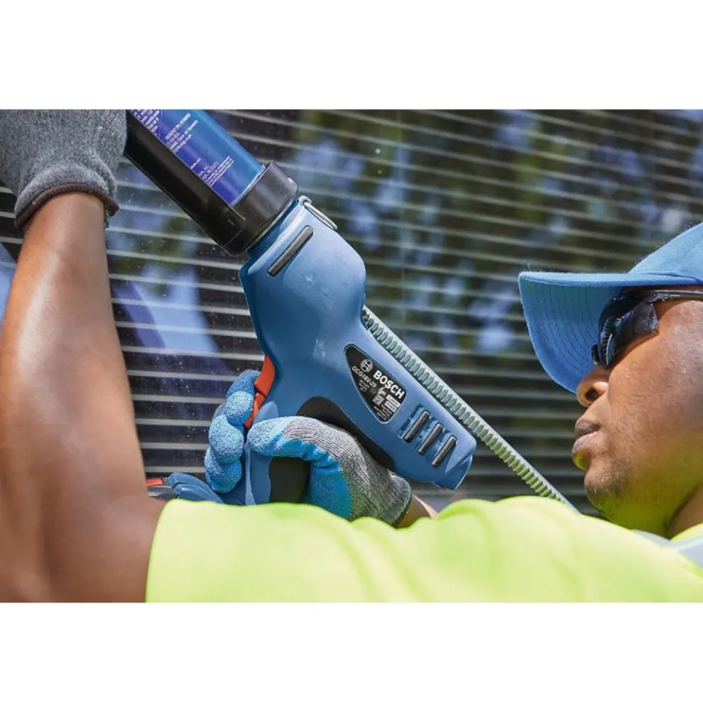 The Bosch GCG18V-29-RT 18V Caulk and Adhesive Gun provides powered caulking to reduce the fatigue on your hand from manual caulk and adhesive guns. It has speed selection and a variable-speed trigger for a consistent bead size and easier caulk application. The caulk and adhesive gun features an auto-reverse feature on the plunger rod to help prevent dripping and material overflow. It holds 29 oz. Tubes and delivers a no-load max of 18 in. per minute feed and 790 lbs. of push force, to push even high-viscosity adhesives including anchor adhesives in concrete. The cage rotates, so that material can be applied in difficult areas while still keeping your preferred hand location. And it’s light only 5 lbs. (tool only, not including battery). It is compatible with Bosch 18V Lithium-Ion batteries, and it fits 29 oz. tubes. The caulk gun has a hook for hanging between jobs and a lockout switch, to the trigger won’t be accidentally activated.