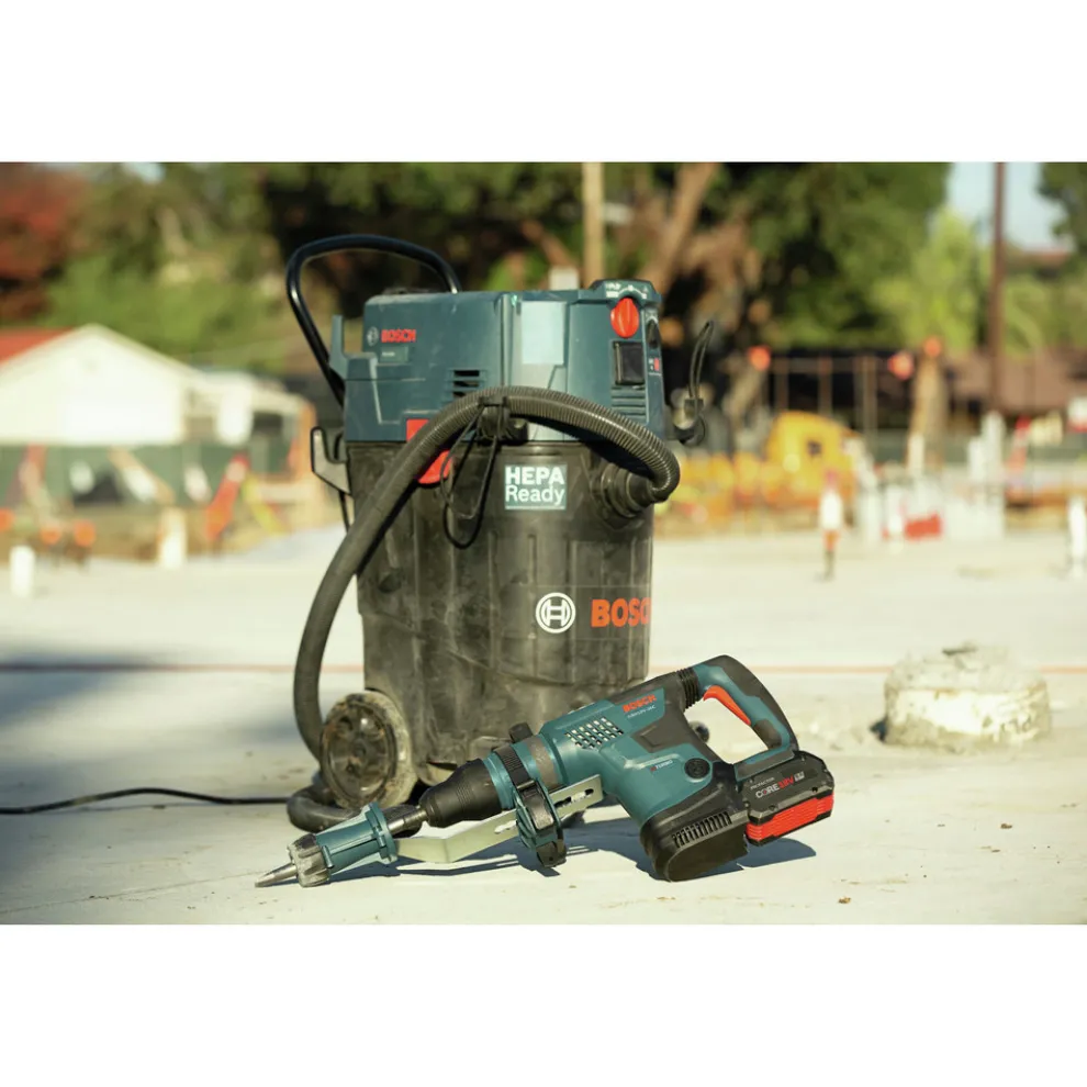 This 18V SDS-max 1-9/16 in. rotary hammer is powerful enough to provide corded-type performance for tackling heavy-duty concrete drilling or chiseling jobs. The Bosch GBH18V-36C-RT Hitman Rotary Hammer delivers 5.2 ft-lbs. of impact energy (EPTA). That is unprecedented for a single 18V battery-driven 1-9/16 in. SDS-max rotary hammer. It weighs 13.4 lbs. (with included battery). This hammer is part of the PROFACTOR System, which pairs BITURBO Brushless Technology with a CORE18V PROFACTOR battery. BITURBO Brushless Technology is a high-performance motor and drive-train system designed to deliver power comparable to high-demand corded tools. The anti-vibration system features a longer air cushion in the hammer tube and dampeners in the handle The hammer has KickBack Control, rotary hammer and hammer-only modes, a reverse setting and Vario-Lock to rotate and lock the chisel. The hammer features an on-tool user interface for tool performance, feedback and control. This hammer features connectivity (module sold separately), providing a link to the free Bosch Toolbox app on a connected device to customize settings. The kit includes (2) CORE18V PROFACTOR Performance Batteries, which are compatible with Bosch 18V tools, and optimized to drive Bosch PROFACTOR tools with BITURBO Brushless Technology, for power comparable to the most demanding corded tools. The kit has a turbo charger with a turbo power boost mode that can charge a CORE18V 8 Ah PROFACTOR Performance Battery up to 50% charge in 15 minutes and up to 80 % in 26 minutes.