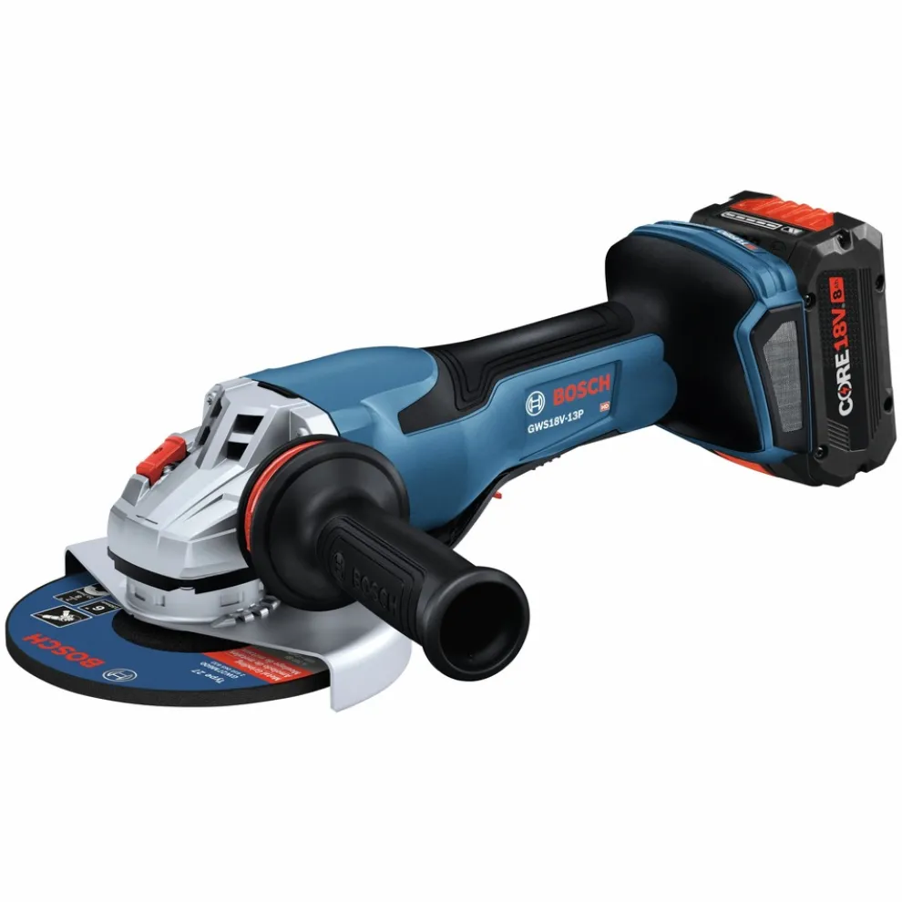 The Bosch GWS18V-13P 18V 5 – 6 in. Angle Grinder with Slide Switch delivers the ultimate combination of performance, control and power in a cordless grinder. This tool is part of the PROFACTOR System, which pairs BITURBO Brushless Technology with a CORE18V High Power Battery. BITURBO Brushless Technology is a high-performance motor and drivetrain system designed to deliver power comparable to high-demand corded tools. The grinder includes KickBack Control, which helps shut off the tool if the wheel gets into a bind situation. It also has restart protection to help prevent accidental tool startup if the supply of power is interrupted. It also includes advanced electronics such as constant electronics and overload protection. The grinder includes a brake system, which helps provide a rapid stop of the wheel when the switch is turned off, and a multi-grip paddle switch, which provides increased grip options for better comfort and control. It features spiral bevel gears for smooth transmission of power, a 2-position Vibration Control side handle, an adjustable tool-free guard, and a slim soft-grip design for additional grip ergonomics. The kit includes a CORE18V 8 Ah High Power Battery, which delivers 50 percent more runtime and over 75 percent more power than the CORE18V 4 Ah battery, powering high-demand applications.